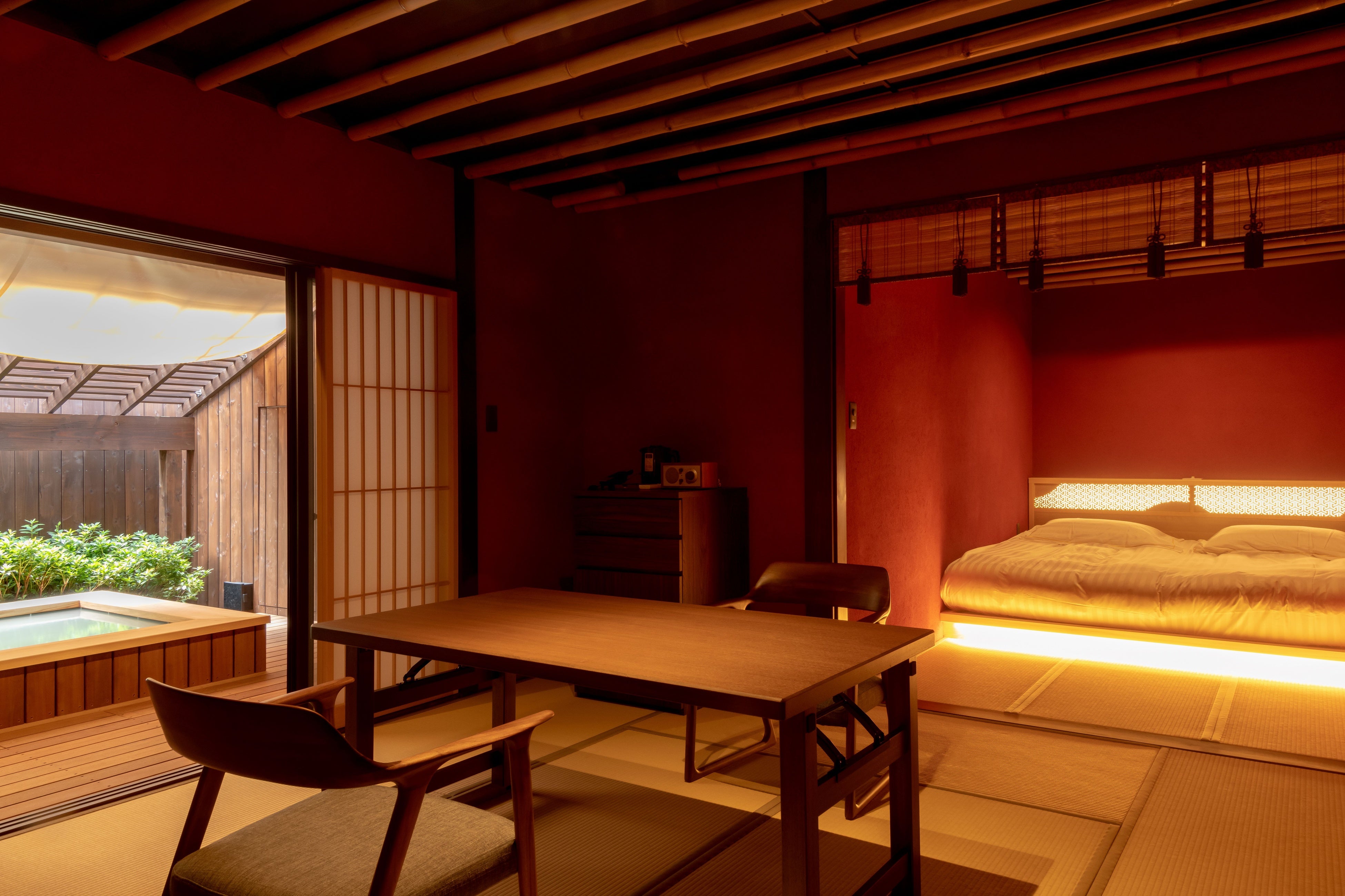 広さ38㎡(客室32㎡)の寝室と露天風呂が「離れ」なのが特徴です。露天風呂にゆっくり浸かったあとは、目の前の寝室でごゆっくりお休みいただけます。