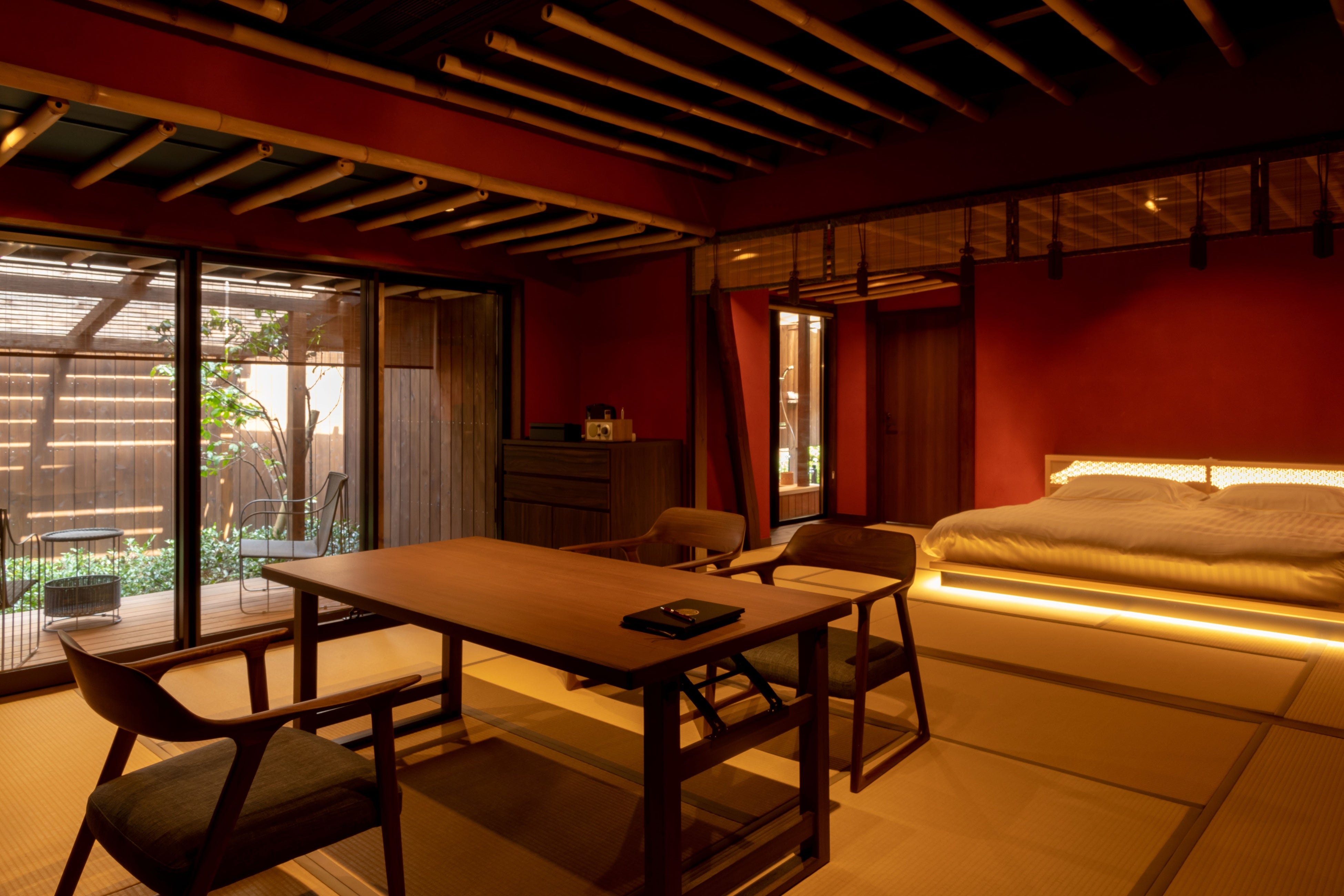 広さ77㎡(客室57㎡)の当館で最も広い客室です。お食事スペース前には縁側があり、寝室横には客室露天風呂があります。最大4名までご利用いただけることも特徴です。