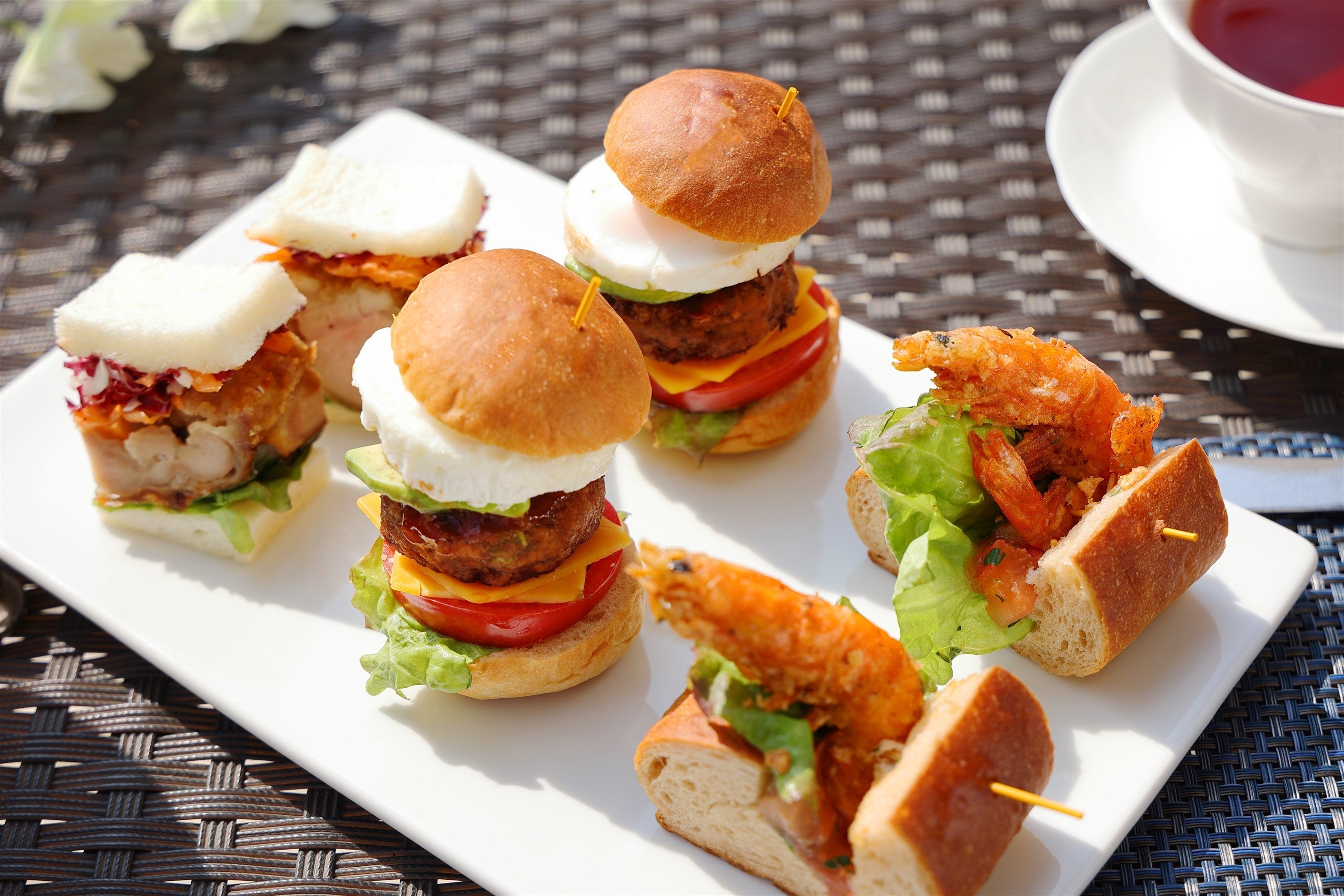 アフタヌーンティーのメニューは、上段には爽やかなグラスが目を引く『ピーチゼリー』と『マンゴープリン』を。中段には、ニューオータニを代表する『スーパーメロンショートケーキ』に加え、『マンゴーショートケーキ』や『ピーチロール』などの夏の人気スイーツをご用意。下段には旬のフルーツを使用した『トロピカルフルーツサンド』など「シェルプール」に合わせてリゾートテイストを盛り込みました。