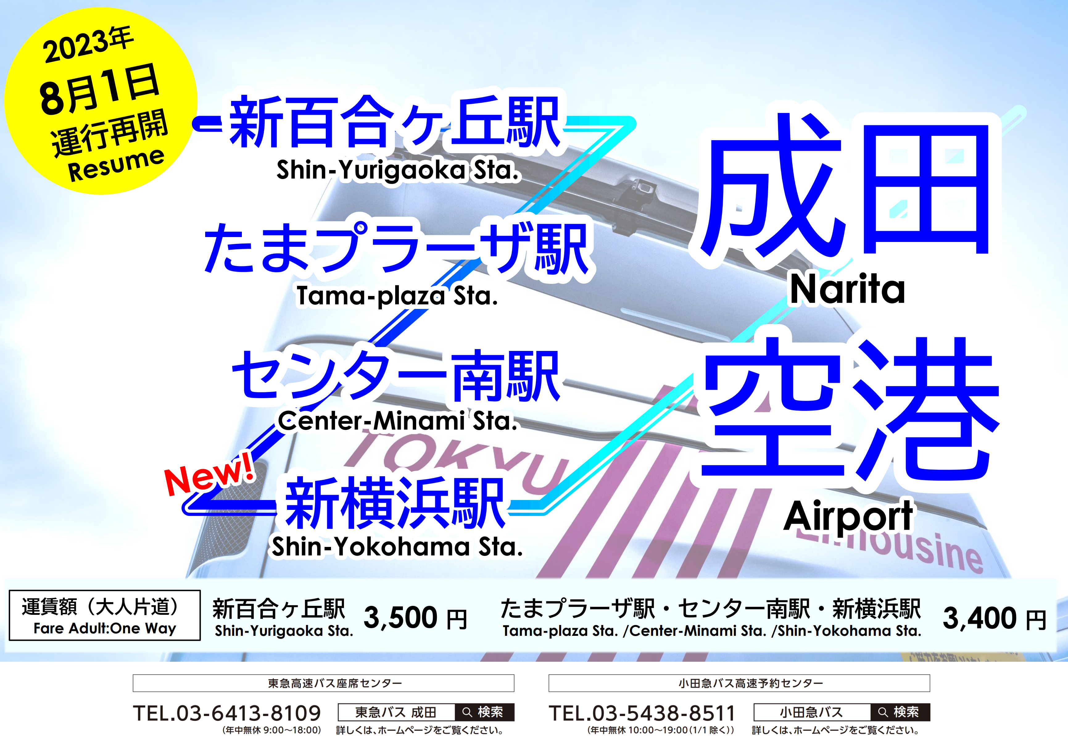 2023年8月1日より「新百合ヶ丘駅・たまプラーザ駅・センター南駅~成田空港」アクセスバスが新たに「新横浜駅」を経由(一部便)し、運行を再開いたします。