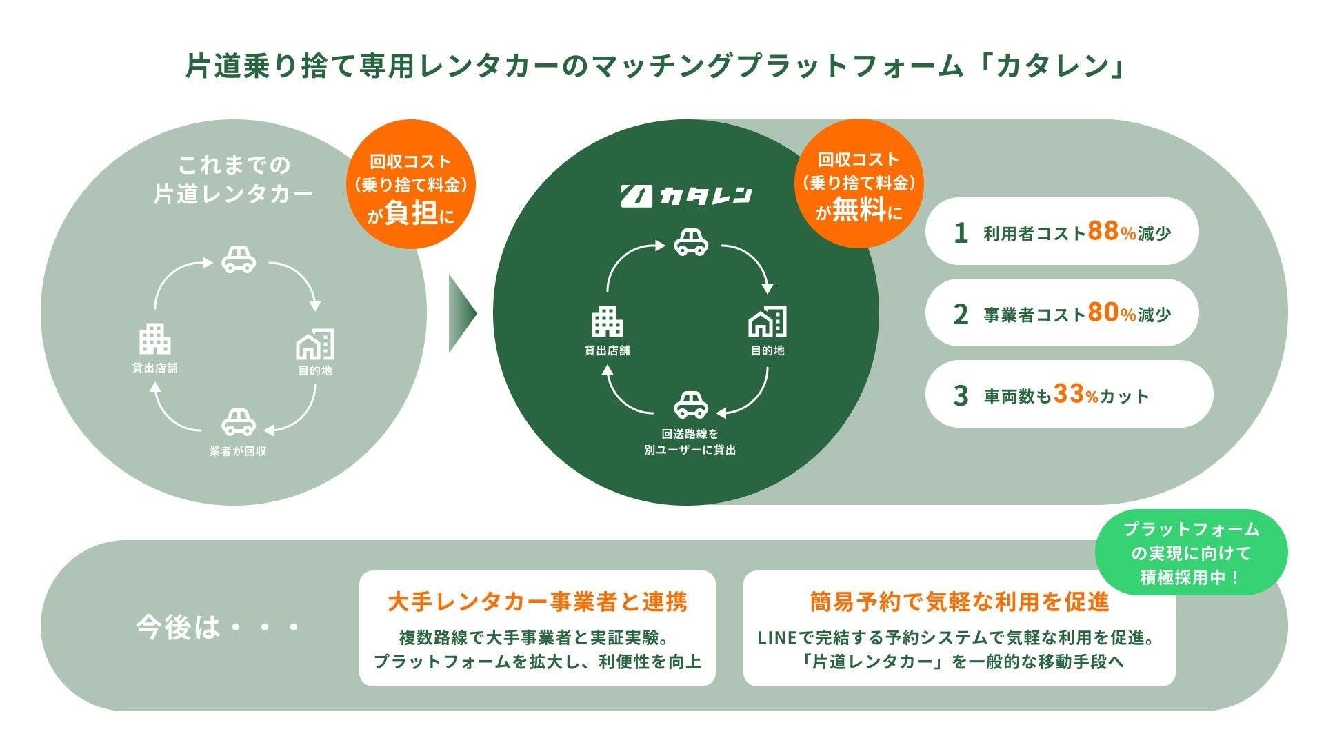 「カタレン」は、レンタカーのアウトレットモールのように、多数のレンタカー・カーシェア事業者様と提携し、回送車両やレンタカーの上り片道利用ユーザーと下り片道利用ユーザーをマッチングさせる「片道乗り捨て専用レンタカーのマッチングプラットフォーム」です。本来レンタカーとして利用されない車両を活用するため、事業者は回送コストを抑えるだけでなく収益に変えることが可能となります。また一般のレンタカー事業者であれば、必要な車両数も削減可能です。