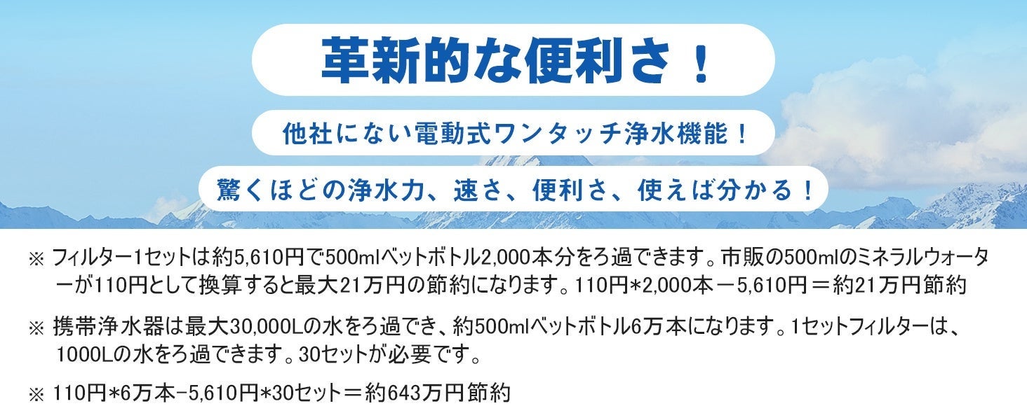 携帯浄水器は、アウトドアに、災害時に使用することができる手軽な水の浄化装置です。河川や湖、 雨水などの水源を浄化し、飲料水として使用することができます。携帯サイズで軽 量かつコンパクトなため、持ち運びに便利です。また、除菌や微粒子除去などの機 能がついているので、より安全に水を利用することができます。いざという時には 非常に役立つ必需品の一つと言えます。