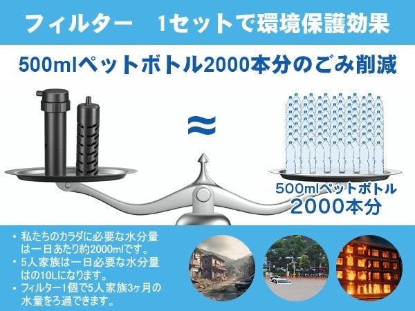 災害や断水などの緊急時、地震、津波、台風などの自然災害が発生した時、川やため池の水、お風呂の残り水などを安心して飲めるほど透き通った清潔な飲料水にろ過することができます。大切な家族の為の災害時の備え! 緊急用に一つ常備しておくことをおすすめします。