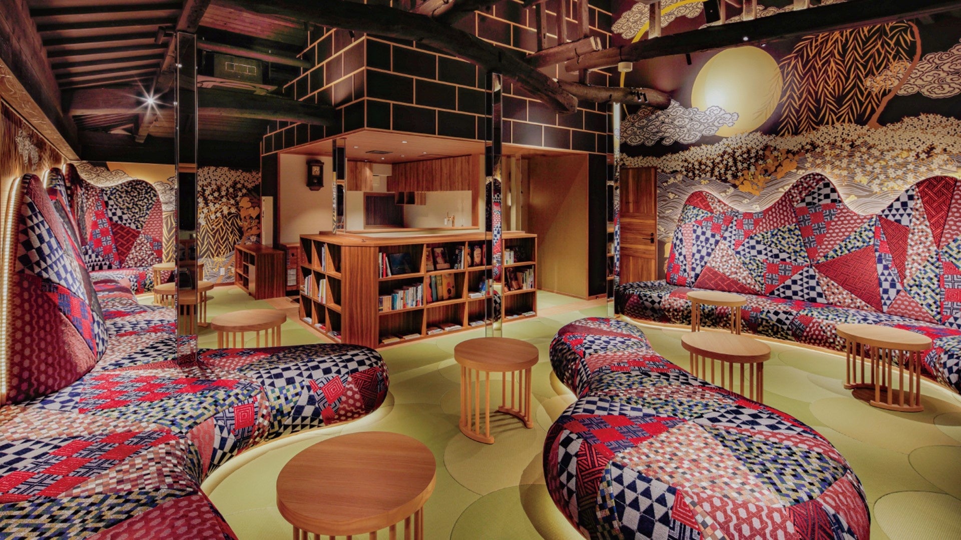 畳と丹後ちりめんでデザインされた3階ラウンジ。窓からは城崎温泉の中心街を一望できます。