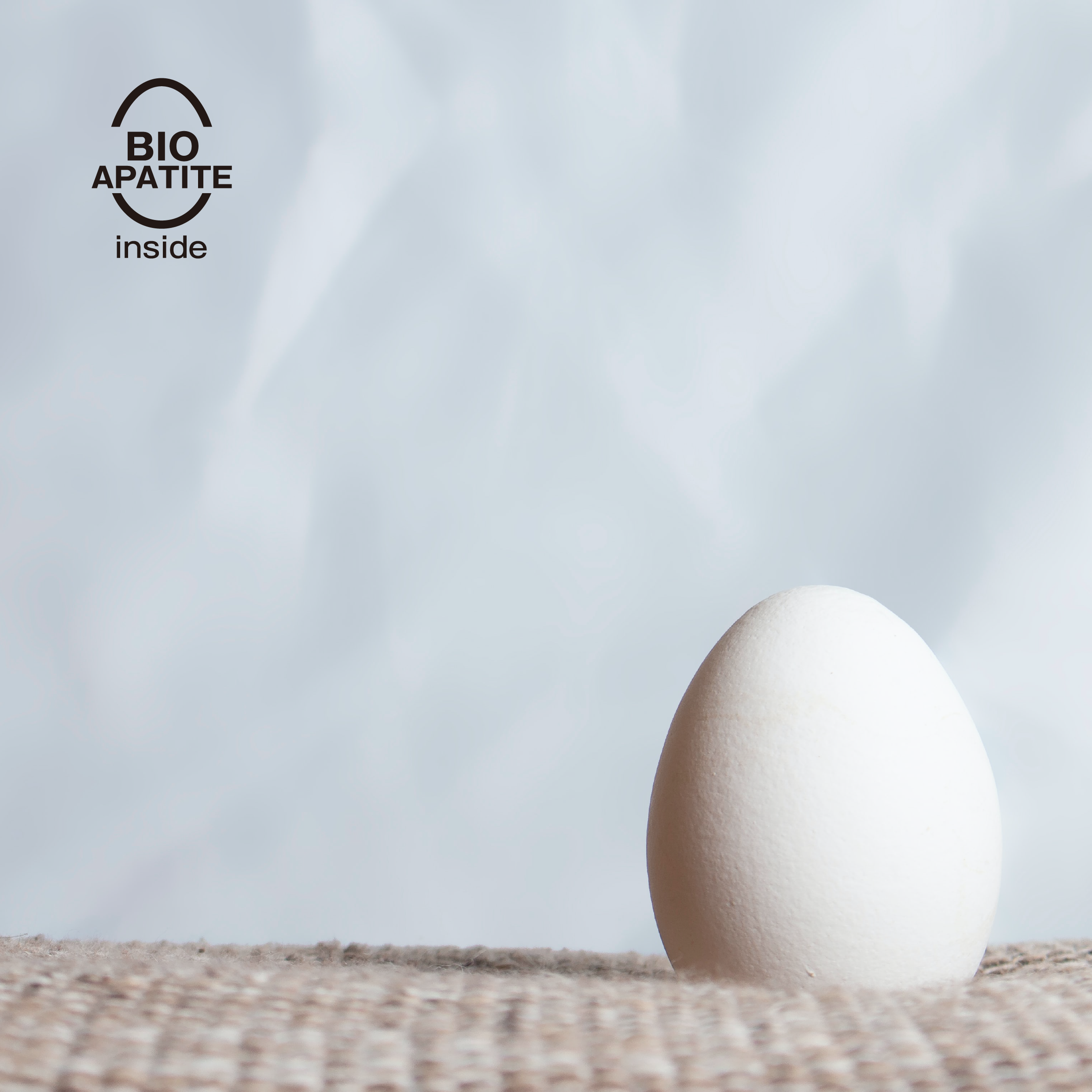 資源として再利用することの難しい卵殻を、バイオアパタイト社〈本社:滋賀〉が、独自の卵殻膜剥離技術により卵殻と卵殻膜の分離に成功した、究極のリサイクル資源であるバイオアパタイト*1を原料として採用しています。