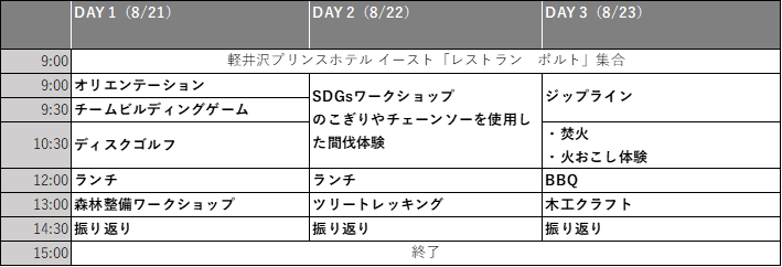 プリンスグランドリゾート軽井沢では豊かな自然にあふれた広大な敷地や豊富なアクティビティを活用し、軽井沢ならではの学び体験の提供として2021年よりイートンハウスとの連携をスタートしました。エリア内での「イングリッシュサマーキャンプ」2回目の開催となる今回は、3日間にわたるSDGsをテーマとしたプログラムを開催します。期間中はツリートレッキングやジップライン、森林の間伐体験を通し、お子さまの自立心を育みます。