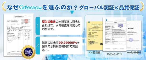 「GS-2801」は、5段階のろ過システムを採用しており、ウルトラプレフィルター、KDFフィルター、高品質の活性炭フィルター、レベルPPコットン、内蔵ウルトラフィルター、そして超高品質の0.01ミクロンマイクロファイバーフィルターを組み合わせて使用しています。これにより、99.9999%の細菌を除去することができます。さらに、厚生労働省の水質基準に適合しており、水質検査成績書によってその安全性が証明されています。驚異的な99.99999%の除去率を実現し、国内の水質検査機関によっても実証されています。この浄水器を使用することで、透き通った清潔な飲料水を手軽に作ることができます。