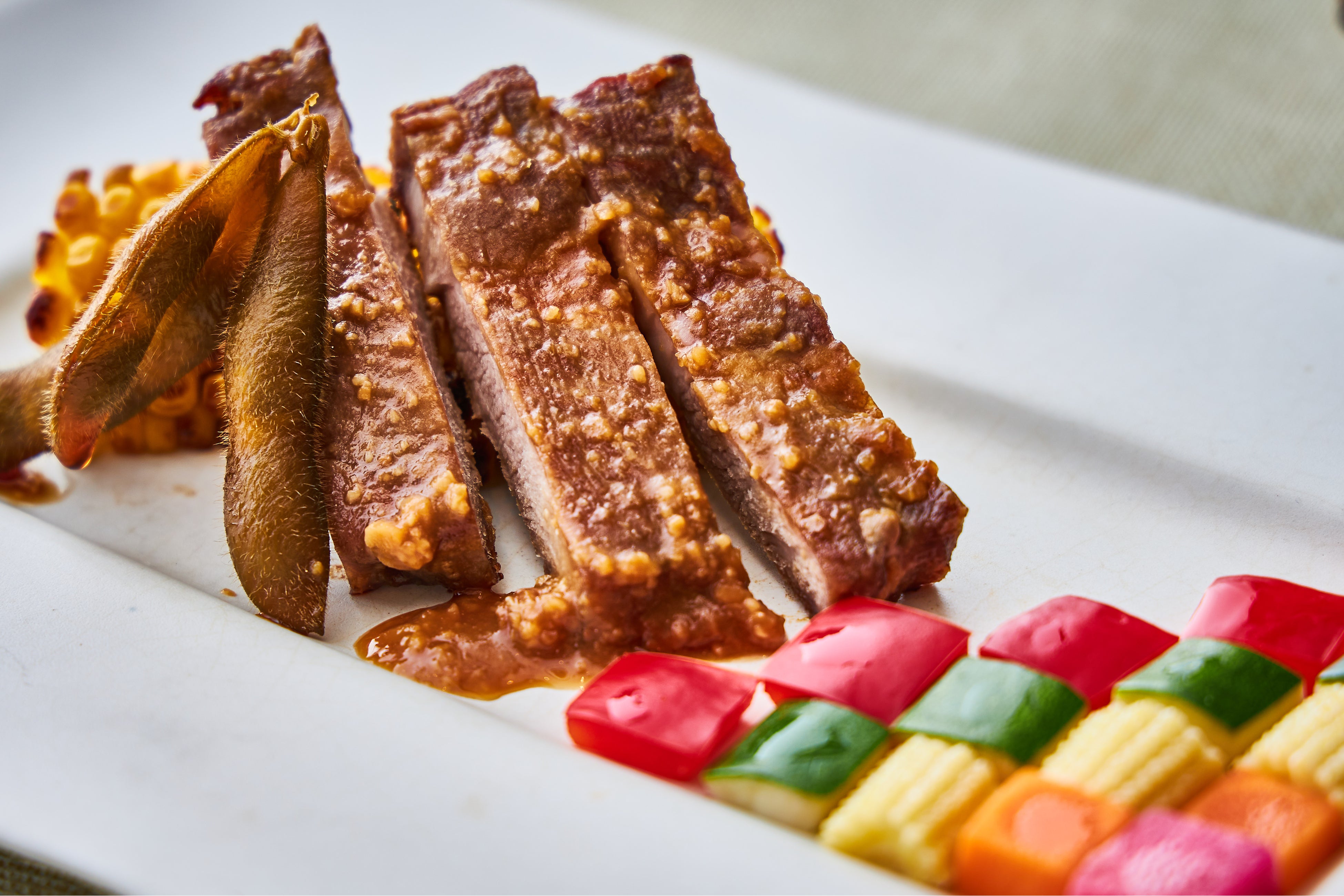 【炭火】 安曇野げんき豚の胡麻味噌焼き と 枝豆の当座煮ととうもろこし 炭の香り仕立て
