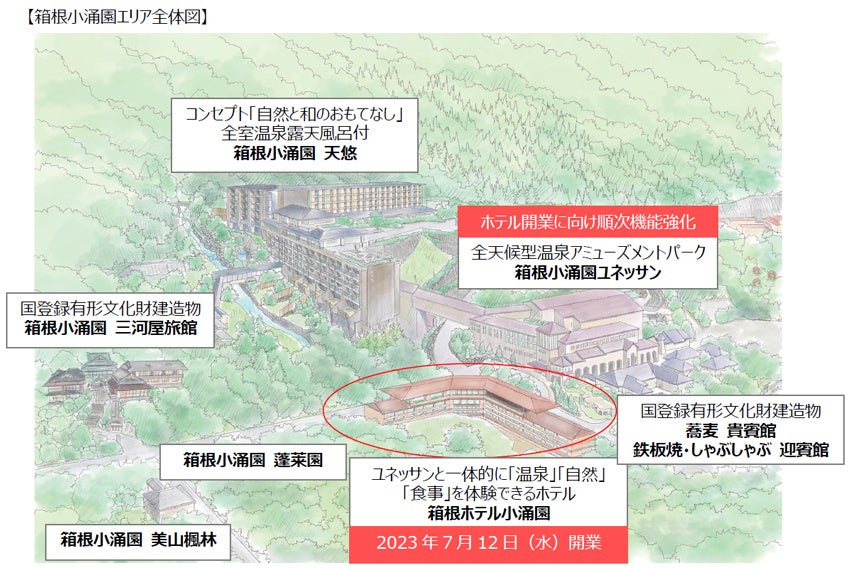 日帰り温泉施設「箱根小涌園ユネッサン」を中心に、その周りにある3つの宿泊施設(箱根小涌園 天悠、 箱根小涌園 三河屋旅館、箱根小涌園 美山楓林)と2つのレストラン(蕎麦 貴賓館、鉄板焼・しゃぶしゃぶ 迎賓館)からなるエリアの総称。箱根小涌園の始まりは、1948年、9室の旅館「箱根小涌園(現:蕎麦 貴賓館)」の開業がルーツであり、藤田観光グループ発祥の地。2023年7月開業の「箱根ホテル小涌園」はエリア4つ目のホテルとなります。