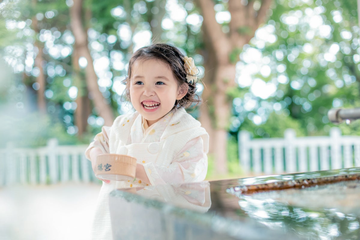 手水舎の周りに涼しい風が吹いおり、手を洗い涼しげに遊びながら撮影できるスポットです。
