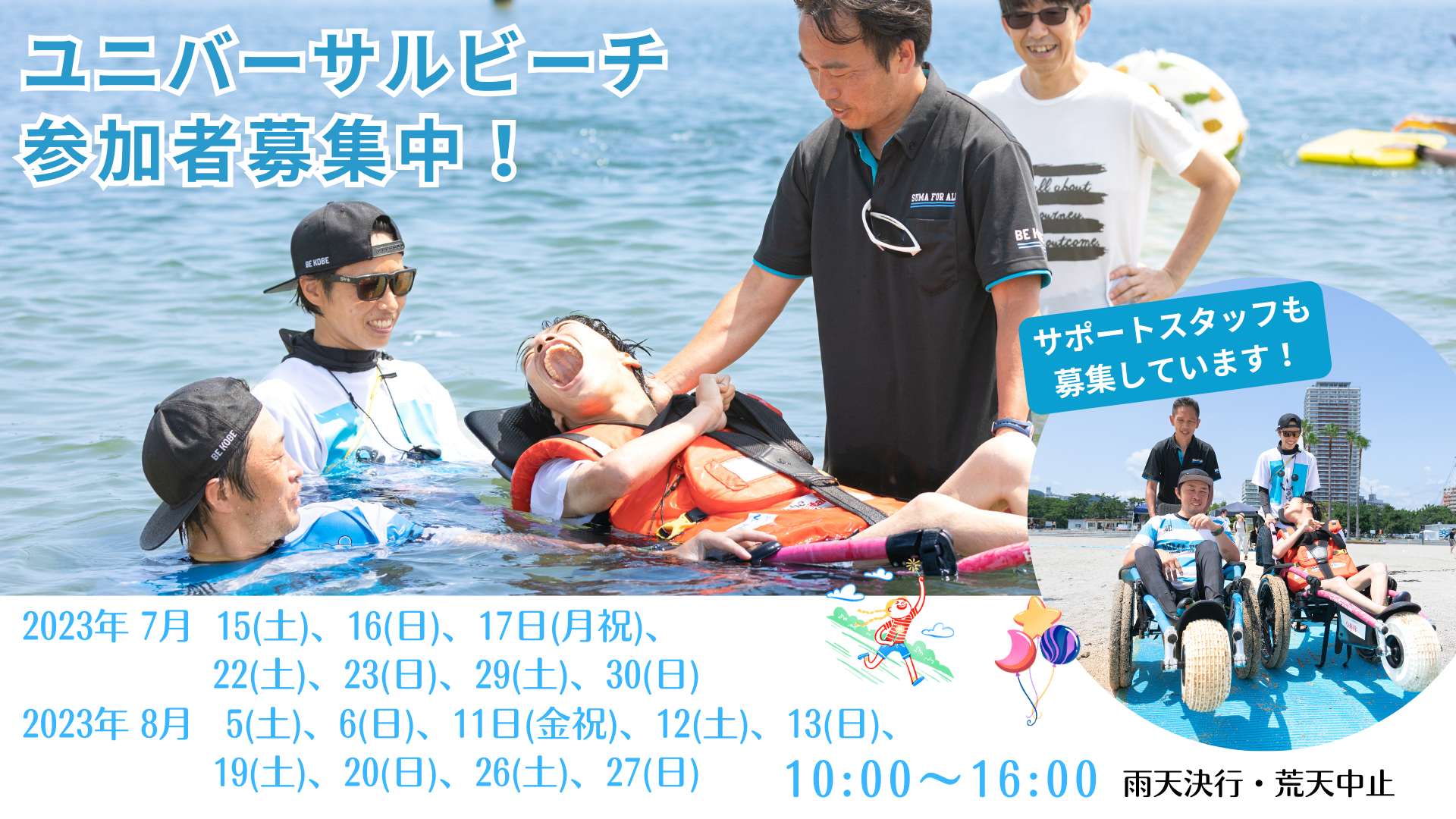 障がいがある人もない人もみんなが一緒に楽しめるビーチづくりを目指すNPO法人須磨ユニバーサルビーチプロジェクトは、須磨海水浴場にてビーチのバリアフリー化と水陸両用車イスを用いたユニバーサルビーチを、海開きの7月13日(木)~8月27日(日)までの毎週末土日祝、10:00~16:00で開催します。