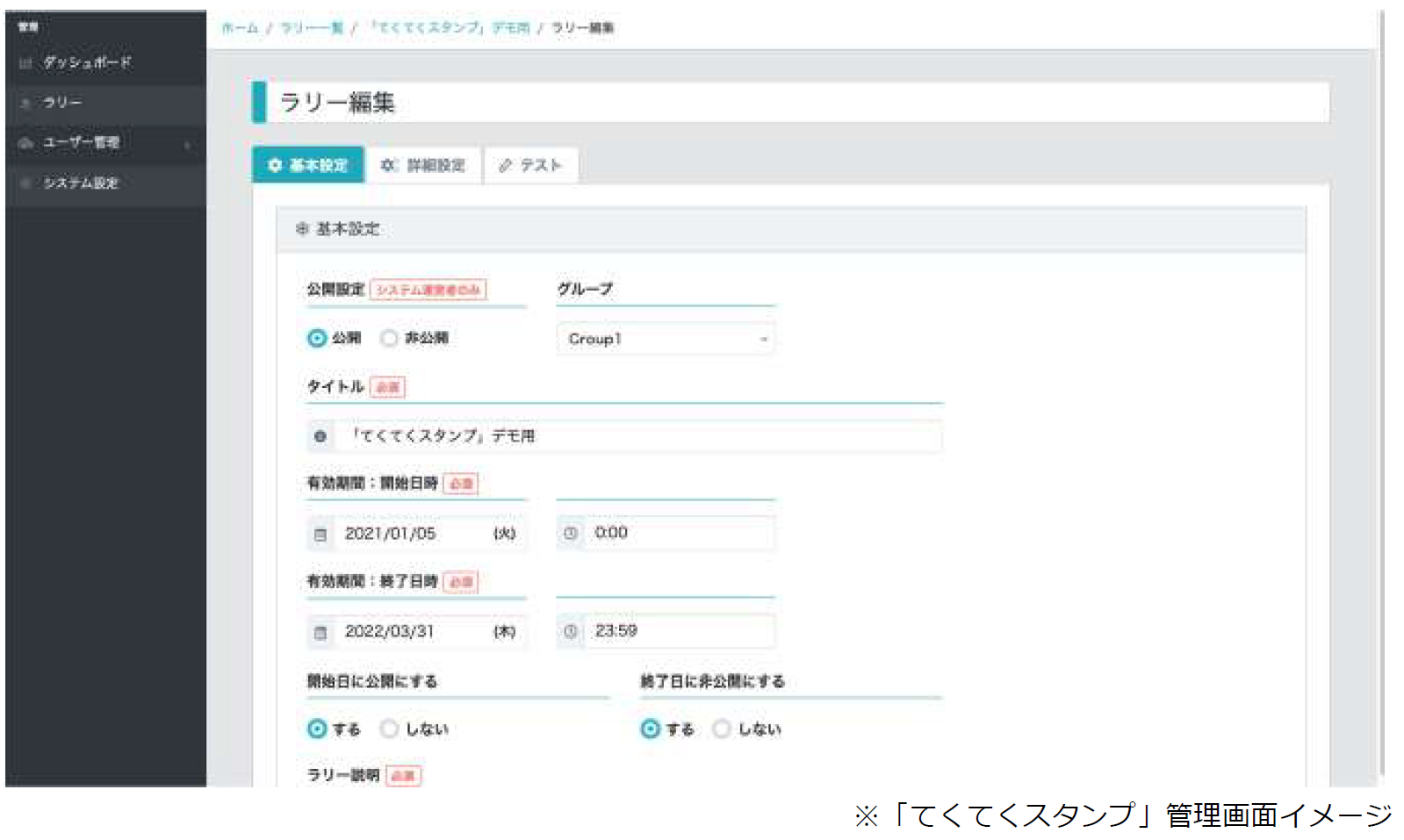 本スタンプラリーでは、当社が提供するデジタルスタンプラリーツール「てくてくスタンプ」が利用されております。「てくてくスタンプ」は、観光・周遊促進やイベントでの集客を目的として、アプリインストール不要のブラウザ型デジタルスタンプラリーツールで、シンプルな画面でデジタルスタンプラリーが初めての方でも簡単にご利用いただけます。また、運用面においても、スタンプラリーの達成条件の設定からスポットの登録、景品の登録管理、参加者の利用状況の確認等、これらの作業を簡単に一括管理することができます。