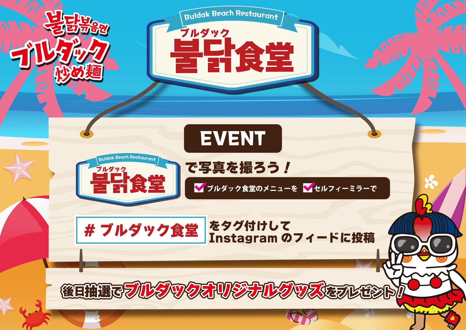 7/1~9/3の期間中に#ブルダック食堂 とタグ付けをした投稿(フィード投稿のみ対象)をしてくださった方の中から抽選でブルダックオリジナルグッズが当たるキャンペーンを実施中!