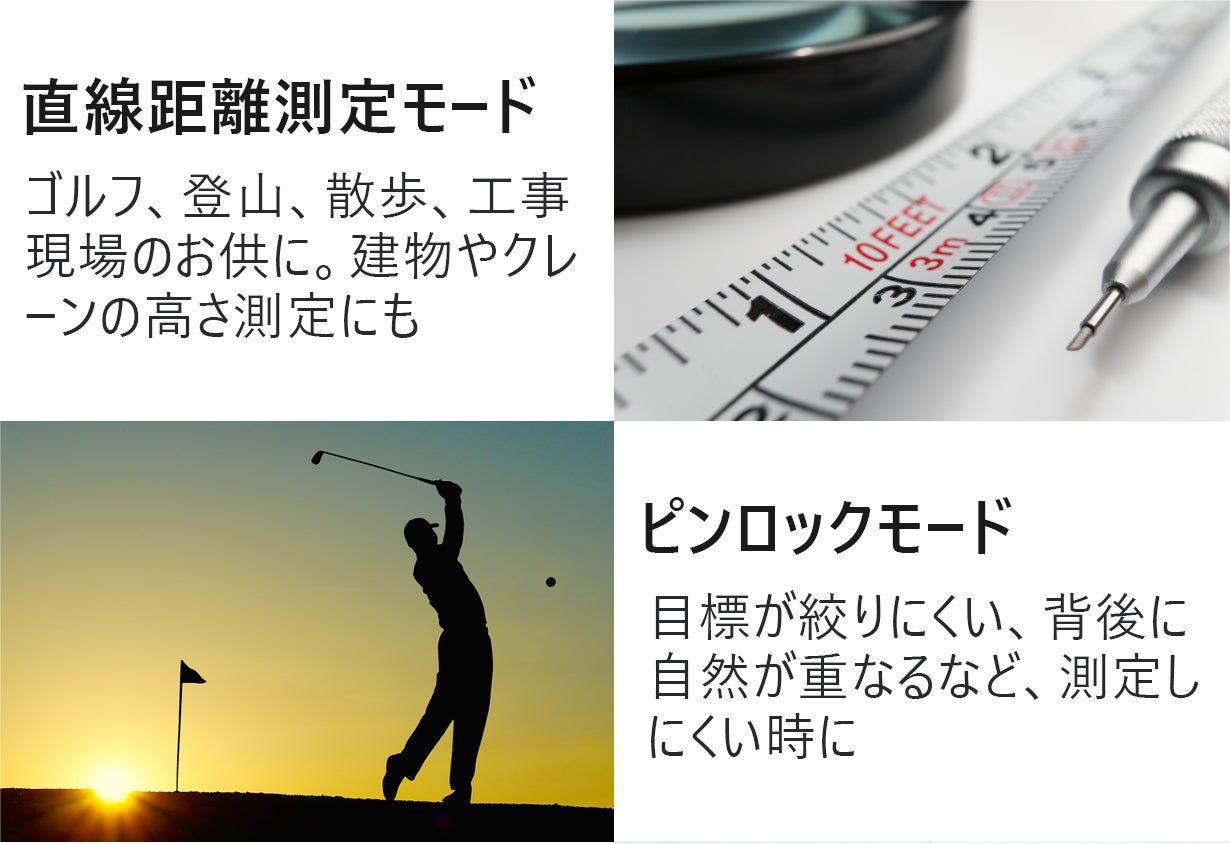 男子プロのドライバー平均飛距離の約4倍である、1200ヤード(約1000m)までの距離を迅速に(0.5秒未満)、そして誤差プラスマイナス1ヤードまでに正確に測定します。6倍率まで拡大でき、実際は300mも離れているのに、まるでたった50mしか離れていないように見えます!