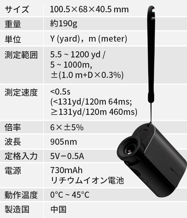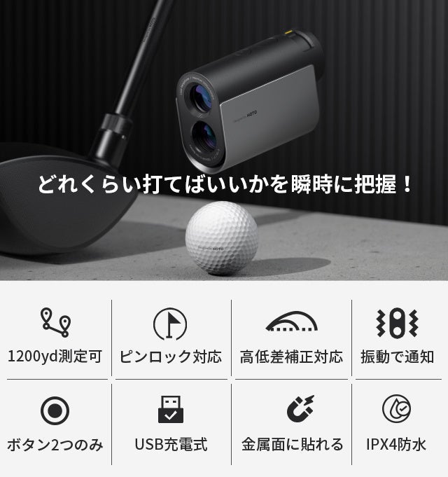 最大の特長は1200ヤード(約1000m)までの距離を測れることです。どんなに長いコースでも「どのクラブを選ぶべきか」「どれくらい打つべきか」を瞬時に測定します。
