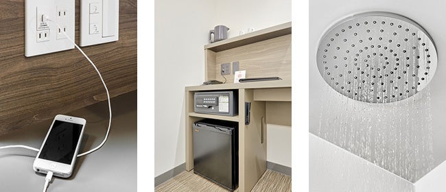 ベッドサイドとデスクにはUSBポートを設置しているため、お休みの際に手の届くところで充電でき、快適にお過ごしいただけます。浴室にはハンドシャワーのほか、天井にレインシャワーを完備。お湯がとても柔らかく、保湿効果、リラクゼーション効果も抜群です。