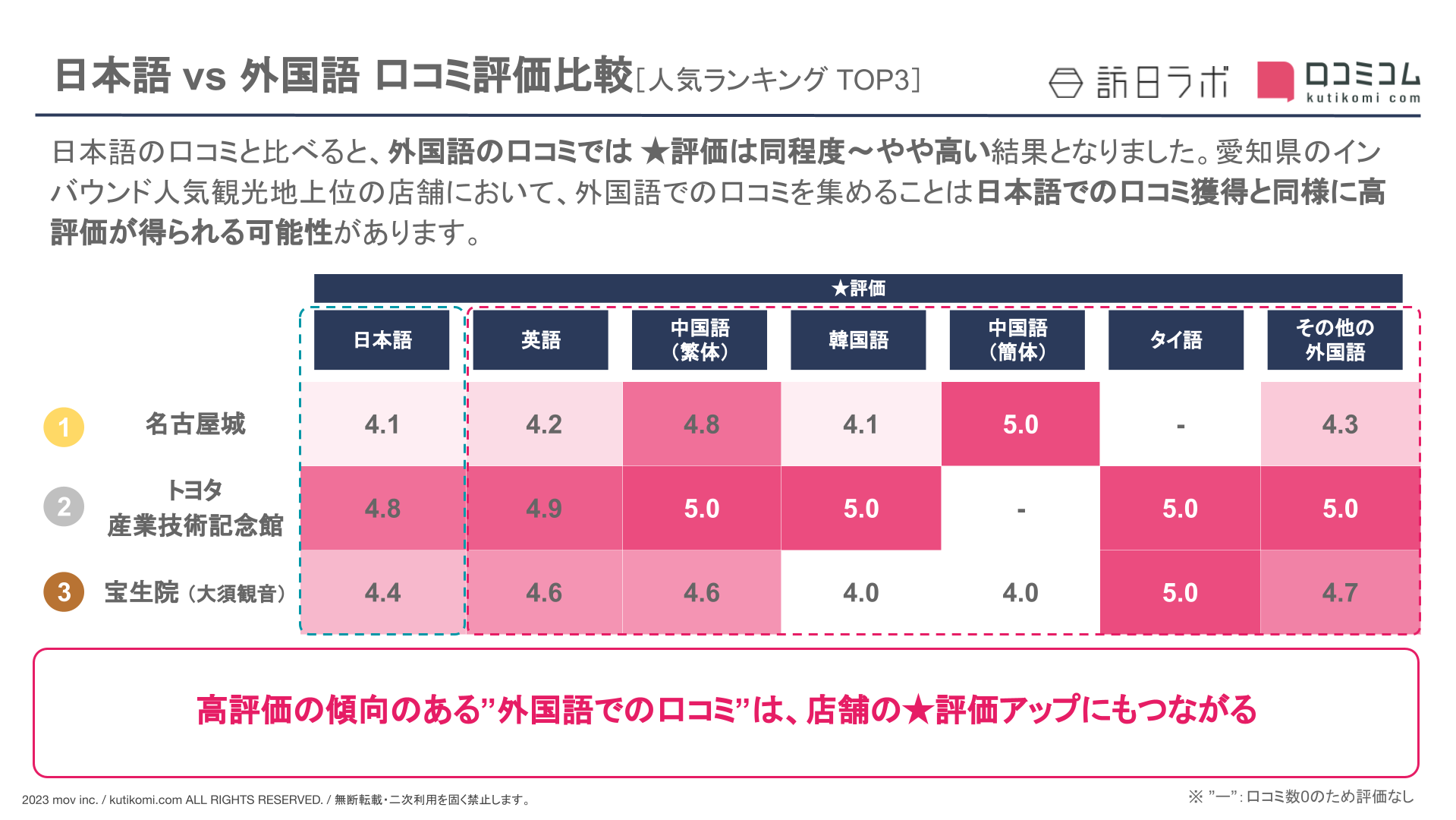 さらに本レポートでは、人気観光地TOP10の口コミ評価を言語別に算出。日本語と外国語との評価を比べてみると、ある特徴が見えてきました。