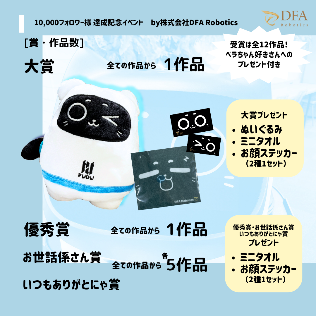 大賞作品投稿者様にはぬいぐるみ、DFA Roboticsオリジナルミニタオル、DFA Roboticsオリジナルお顔ステッカーを進呈いたします。