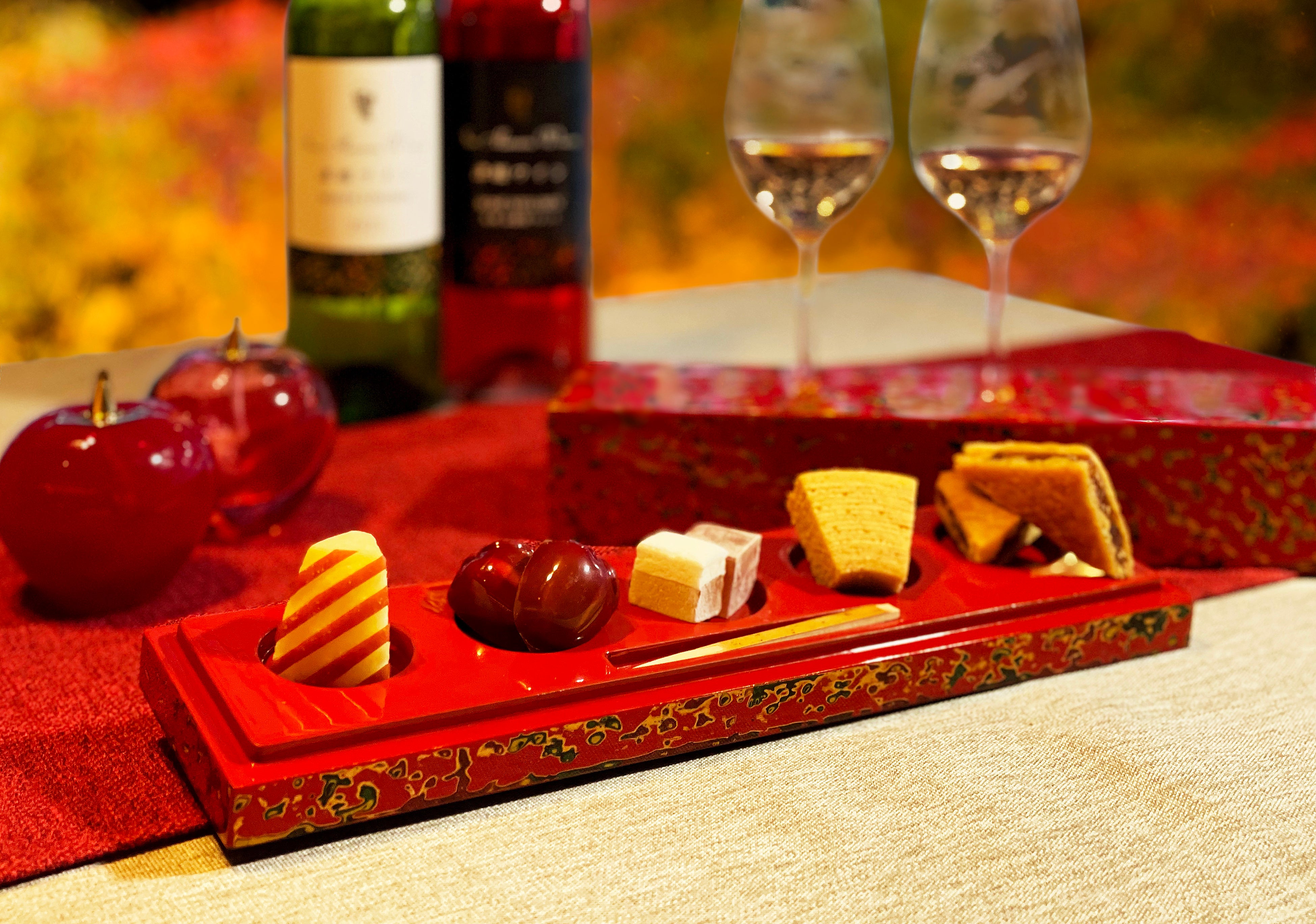 赤く染まった津軽塗のお菓子箱には、風味や食感、香りの異なる5種のりんごのデセールを詰めています。青森の食材にこだわったボンボンショコラや、津軽のりんごを100%使用したりんごジュースで作ったフランスの洋菓子、りんご栽培に恵まれた津軽の高地で育った旬のりんごなどをセレクトし、とことん津軽の食材にこだわったデセールセットを提供します。