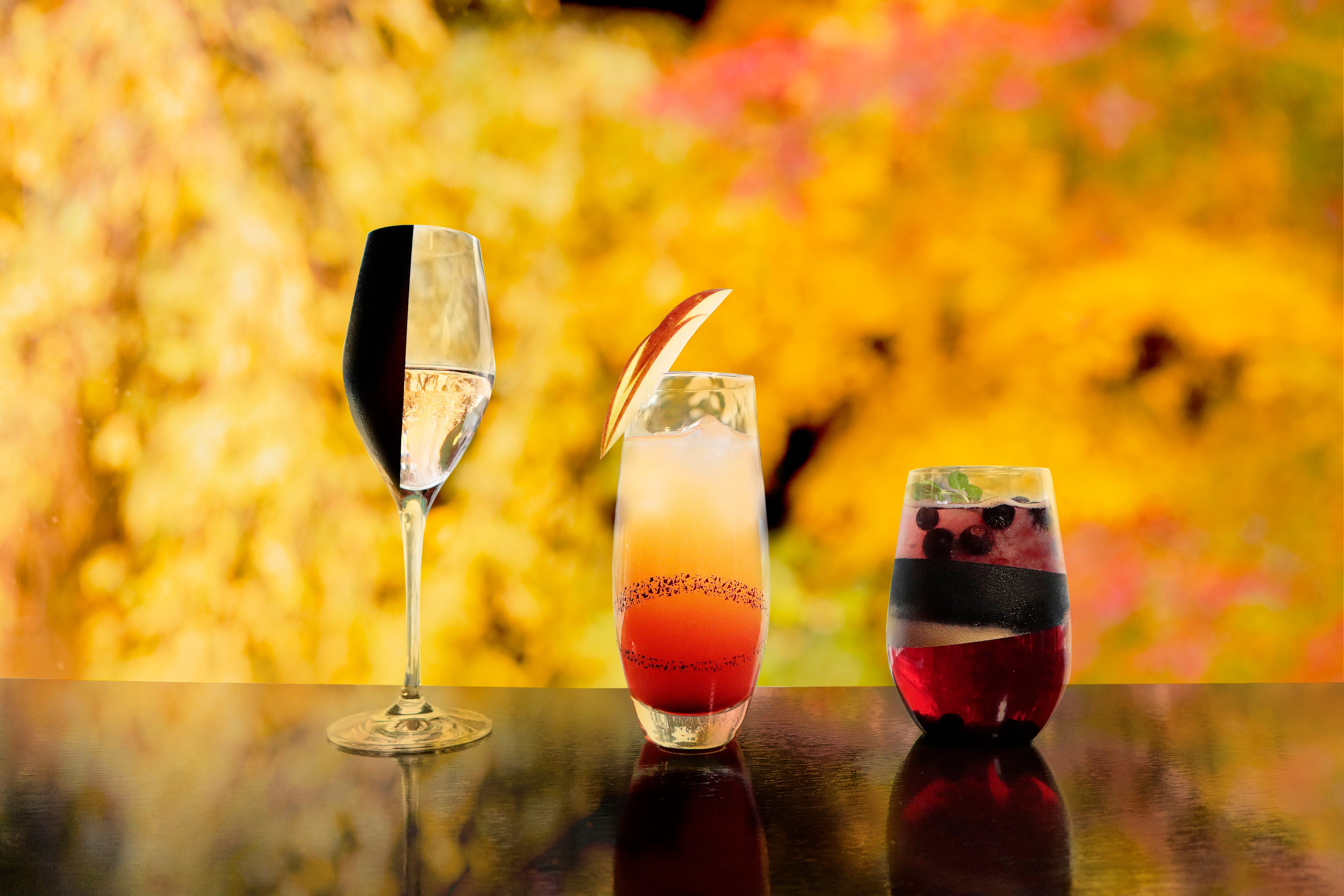 青森の名産であるりんごやスチューベン、カシスを使用した3種のオリジナルカクテルを用意します。りんごやカシスのカクテルには食感を楽しめるように、すりおろした旬のりんごやカシスの実を合わせました。また、カクテルの色合いは黄色から赤色へと移り変わる紅葉の美しさを表現し、見た目からも秋を感じることができます。
