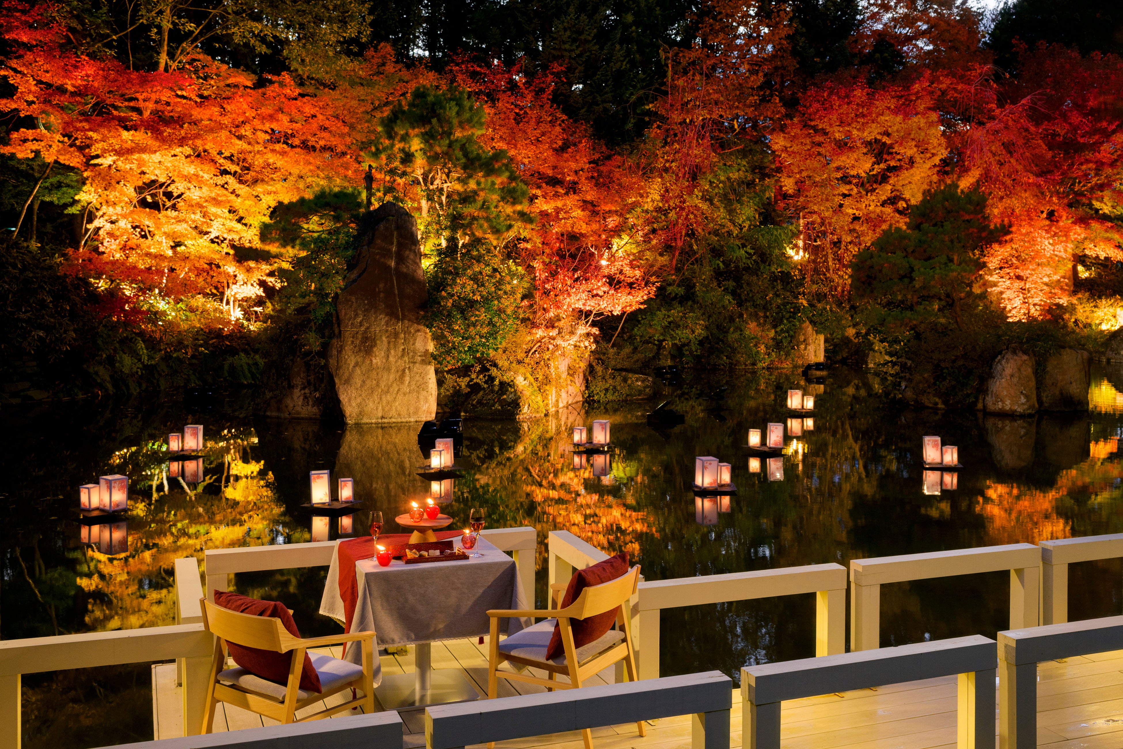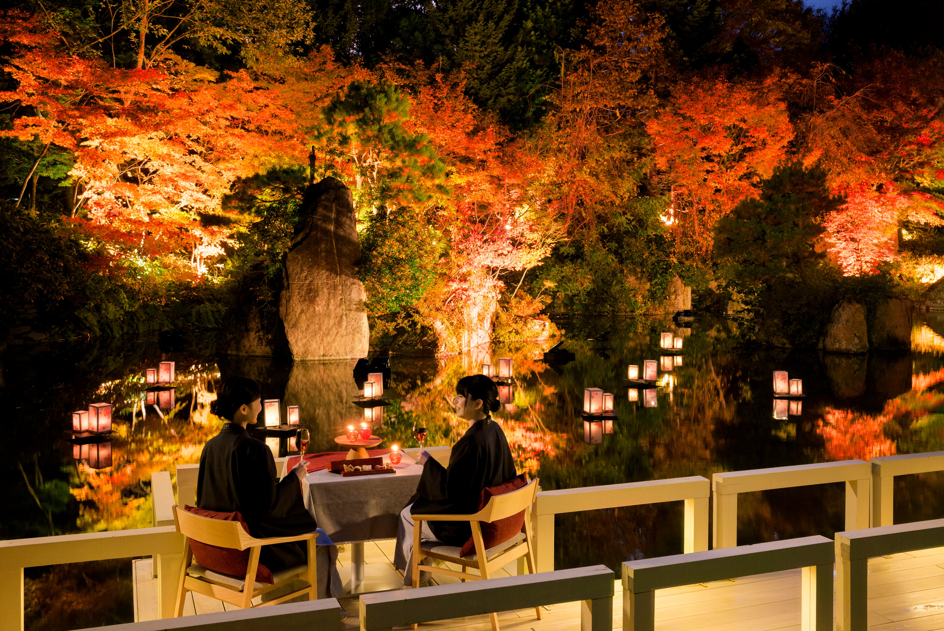 ライトアップされた夜の「津軽四季の水庭」に、紅葉をイメージした灯篭が浮かび、鮮やかな紅葉は昼間とは違った幻想的な風景へと変化します。1日1組限定の貸し切り席で、明かりによってさらに美しい色合いを見せる紅葉や、風情を感じる水面に映る紅葉を眺めながらゆったりとしたプライベート空間を楽しむことができます。