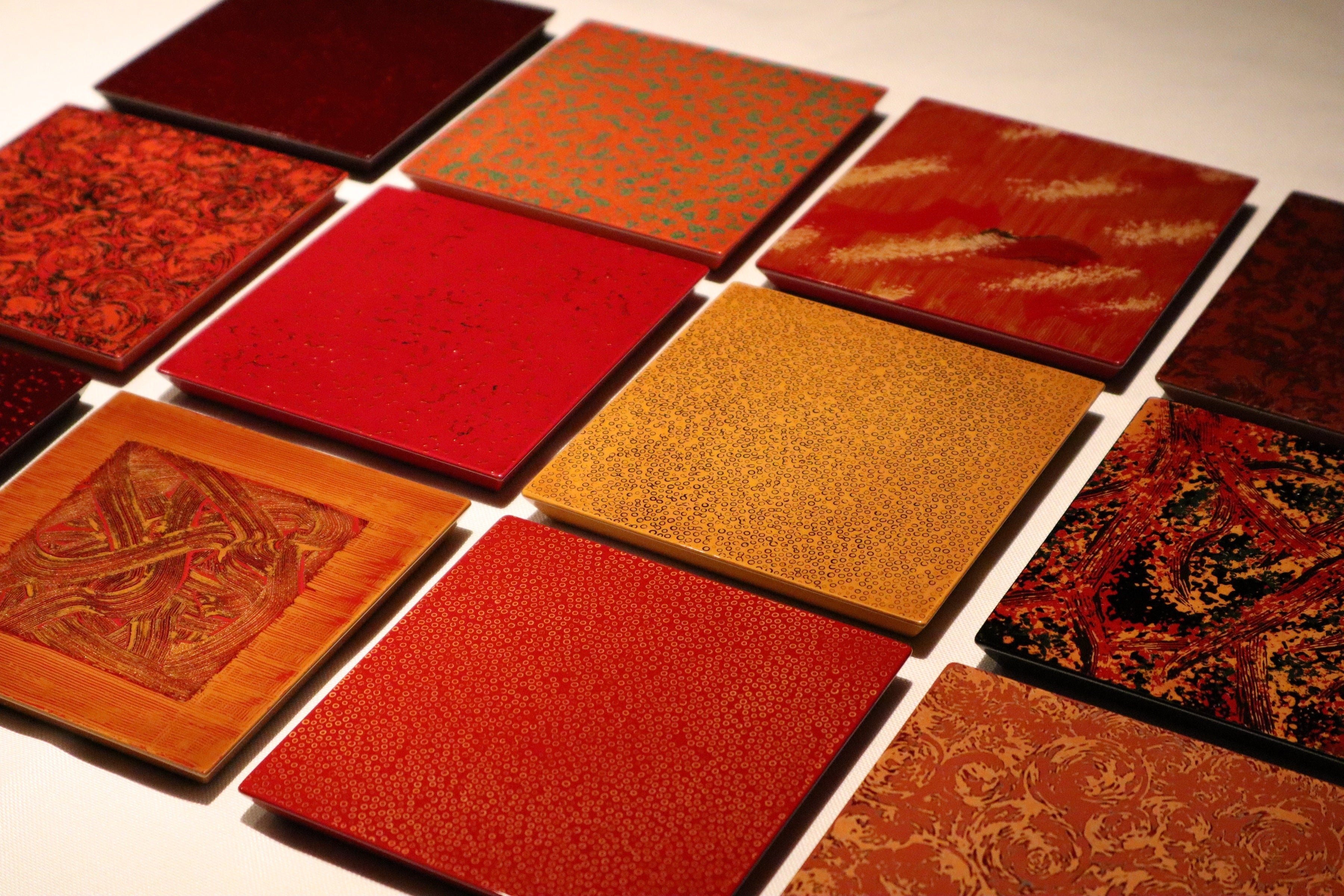 テラスを楽しむテーブルには、塗り重ねが生む艶やかな塗りや模様が特徴の、津軽の伝統工芸「津軽塗」の器が並びます。今年は秋や紅葉を連想させる、さまざまな技法を使った12種類の津軽塗のコースターや津軽塗独特の手触りを触って楽しめる酒器を好みの組み合わせで楽しむことができます。