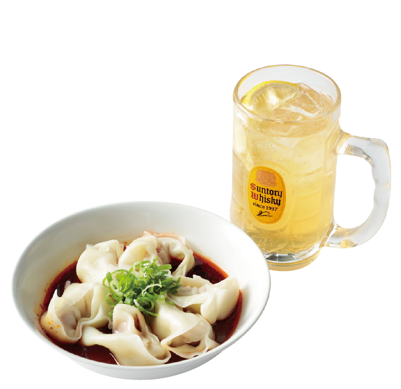 ピリ辛のえび入りワンタンとスライス生姜とレモンが香るオリジナルの辛口ハイボールがよく合います!
