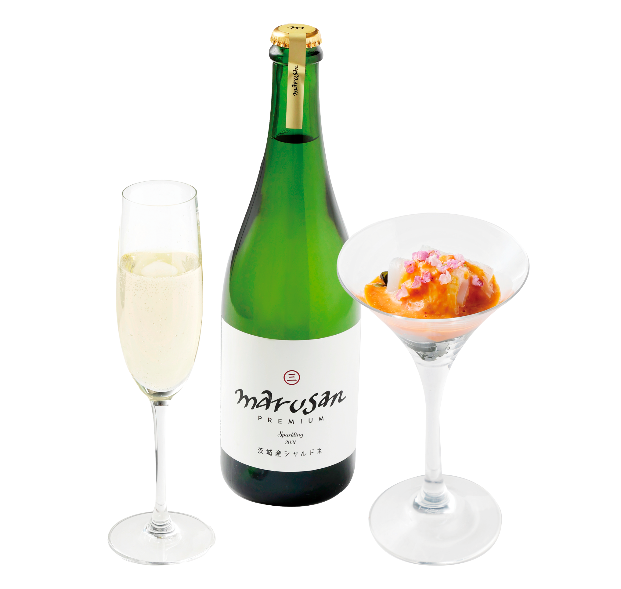 近海で獲れた旬のいかを細造りにし、自家製雲丹正油で召し上がっていただく一品。茨城で生産された国産シャルドネ種の微発砲白ワインの上品な味わいとのマリアージュをお楽しみください。