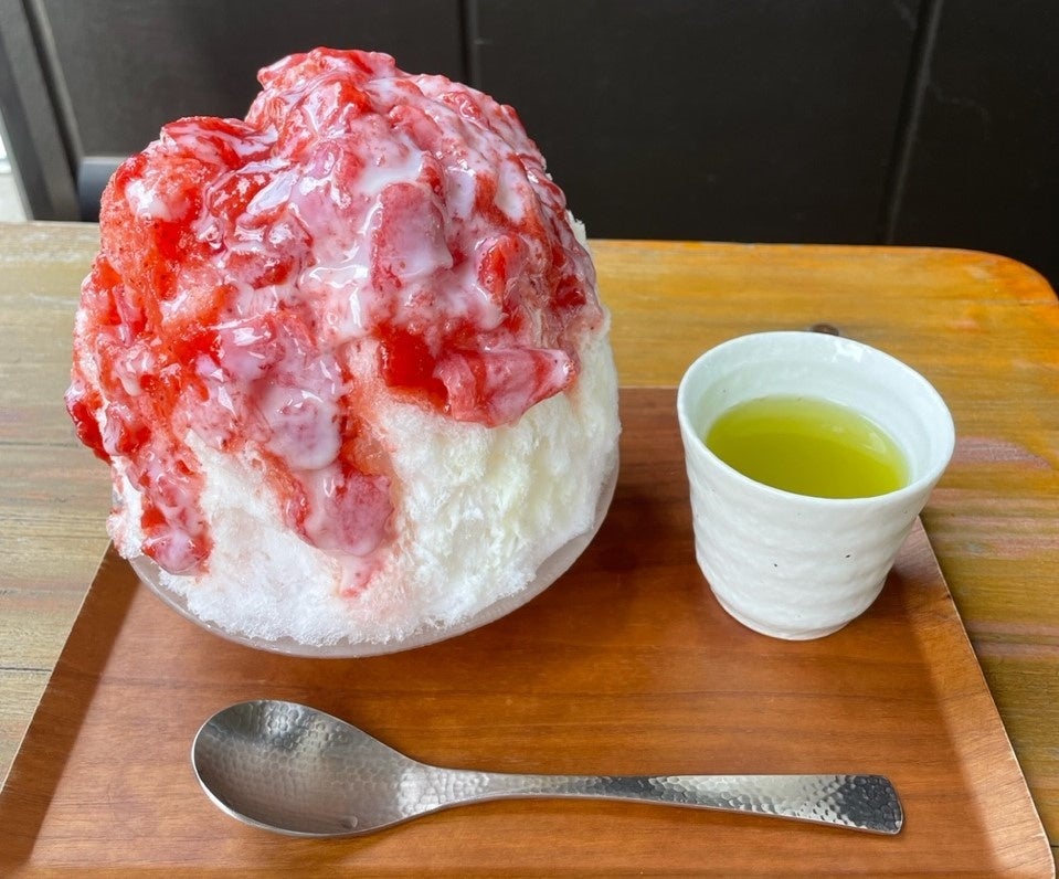 濃厚な抹茶みつがたっぷりかかったかき氷に、厳選した抹茶をふんだんに使った手づくりの抹茶わらびもちの食感と、白玉のもちもち感で満足感に浸れる「宇治金時」です。