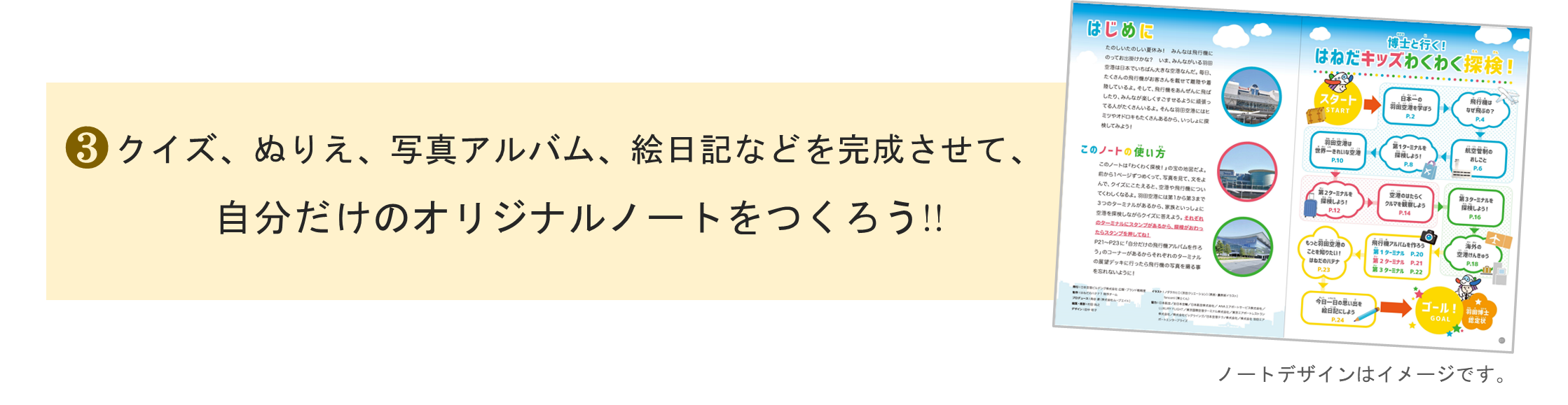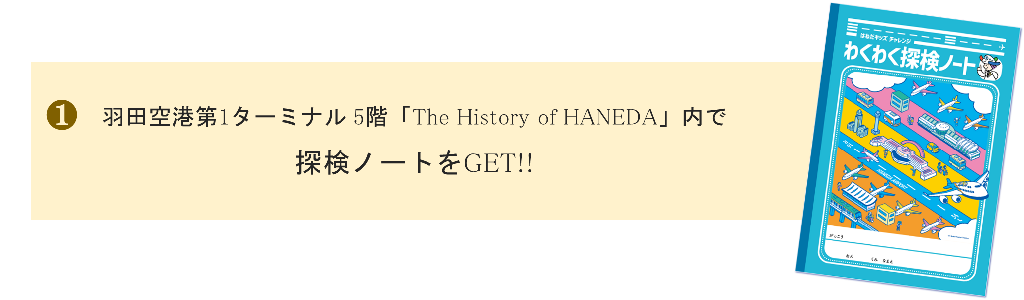 本イベントは、第1ターミナル5階「The History of HANEDA」内にて無料配布する探検ノートをもらい、羽田空港や飛行機について学びながら、第1・第2・第3ターミナルを探検する小学生向けの参加無料イベントです。羽田空港を探検しながら、クイズやぬりえ、写真アルバムや絵日記を完成させて自分だけのオリジナルノートをつくり、羽田空港博士を目指しましょう!ご参加されたお子さまにとって、空港・航空業界への理解や知識、関心を高めるきっかけとなることはもちろん、自由研究としてもご活用ください。夏の思い出づくりに是非羽田空港にお越し下さいませ。