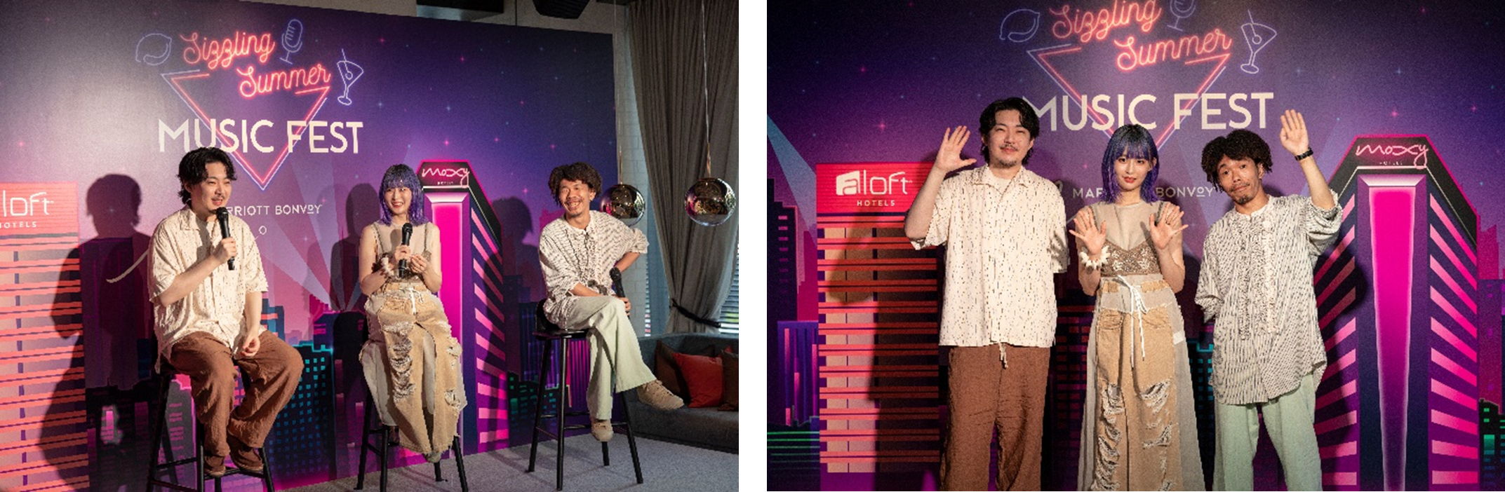 マリオット・インターナショナル(本社:米国 メリーランド州、最高経営責任者CEO:アンソニー・カプアーノ)が展開する31のブランドの旅行プログラム『Marriott Bonvoy (マリオット ボンヴォイ)』は、7月11日(火)にアロフト東京銀座にて、日本のアロフト、モクシー ホテルをはじめとするお客様が多種多様な音楽を堪能できるホテルにて様々な音楽イベントを開催するSizzling Summer Music Fest(シズリング・サマー・ミュージック・フェスト)のローンチ記者発表会を行い、プロジェクトの詳細と実施背景を説明、サマーソニック2023東京のメインスポンサー就任を発表いたしました。また本プロジェクトの第一弾として、Marriott Bonvoyの会員の方に向けて、メンバー自身の幅広いルーツをMIXした音楽性を持つ、男女ツインボーカルの3人グループAwesome City Clubによる限定スペシャルライブ、ミート&グリートを行いました。