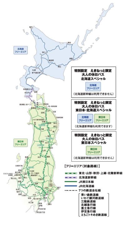 ・フリーエリア内のJR東日本全線(東日本・北海道スペシャルはJR北海道全線)、青い森鉄道線、いわて銀河鉄道線、三陸鉄道線、北越急行線、伊豆急行線、富士急行線、えちごトキめき鉄道線(直江津~新井間)の普通列車と特急等(新幹線を含む)の普通車自由席およびJR東日本が運行するBRT(バス高速輸送システム)が連続する4日間または5日間乗り降り自由です。