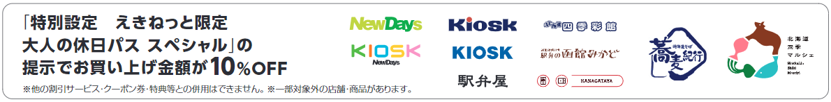 「特別設定 えきねっと限定 大人の休日パス スペシャル」のきっぷをご提示いただくと、ジェイアールバス東北の一般乗合バス対象路線が普通運賃より10%割引の会員価格でご乗車でき、NewDays等のエキナカでのお買いものが10%割引になるなど、様々な特典や割引サービスをご用意しています。