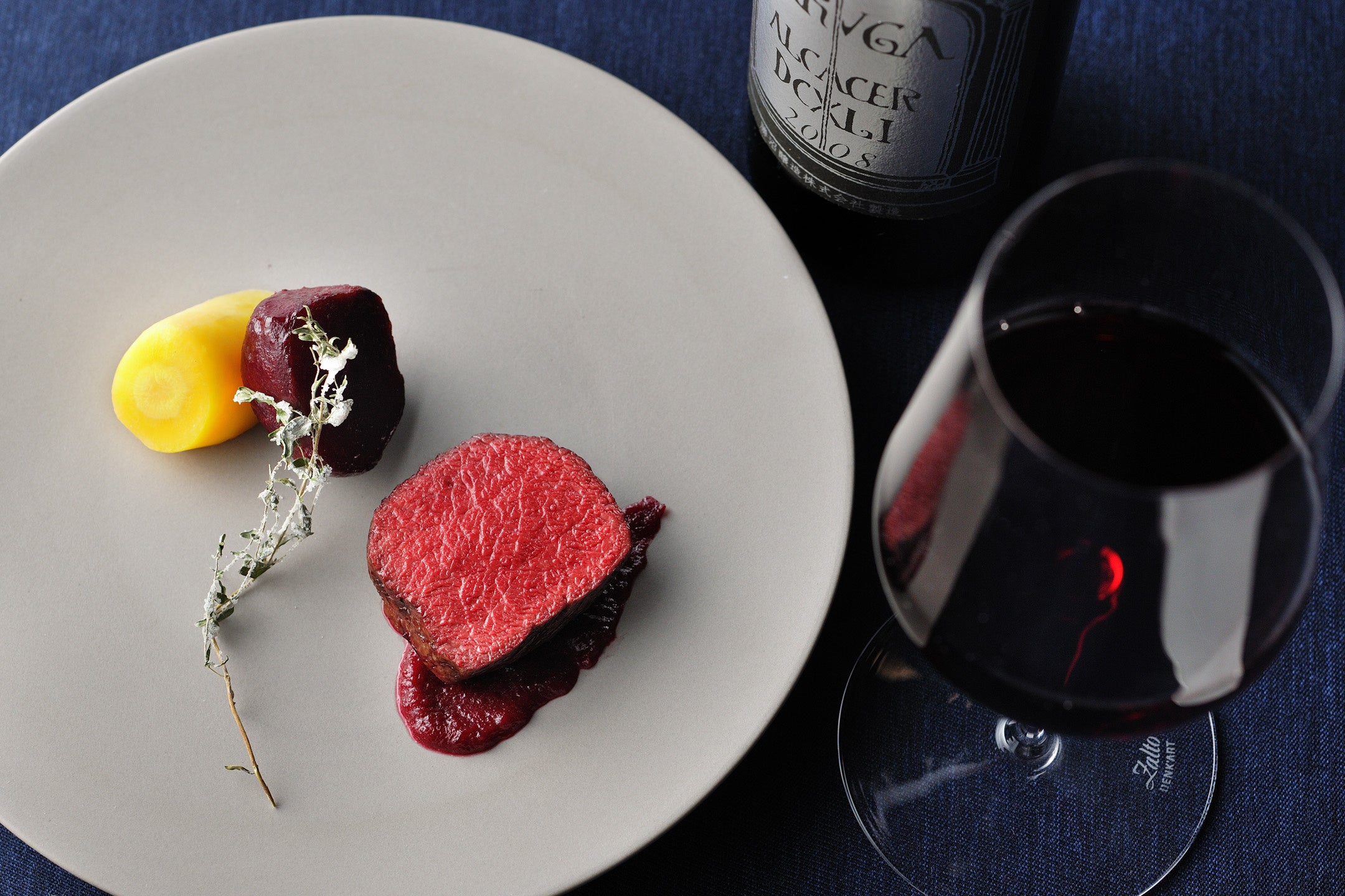 個性豊かなヴィンテージ違いのワインを狩猟肉とともに楽しむペアリングディナーに仕上げました。ヴィンテージごとに異なるワインの特徴を捉え、引き立てるような食材や調理法で楽しみます。例えば、「アルガアルカサール2008年」と合わせたのは、鹿ロースの岩塩ローストです。タンニンがしなやかで上品な味わいが特徴の赤ワインに合わせて、しっかりとした味わいの赤身を持つ鹿肉を岩塩ローストで味わいます。滋味深いビーツとフランボワーズビネガーを使ったソースを付けることで、甘酸っぱさとキャンディ香が加わり、ペアリングワインの優しい渋みのある余韻をさらに楽しむことができます。秋ならではの狩猟肉料理と山梨ワインのマリアージュを堪能します。