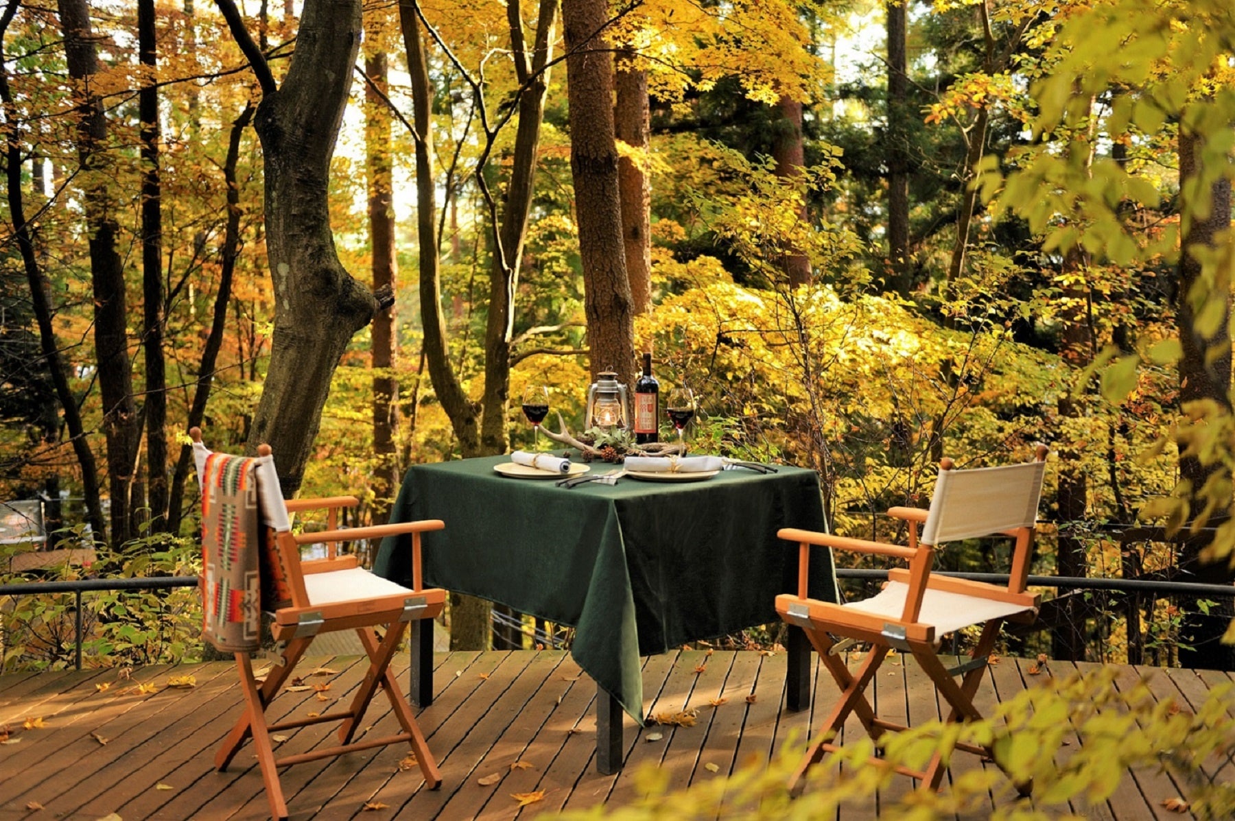 森に囲まれたクラウドテラスに、1日1組限定で黄葉を楽しめる特別席を用意します。特別席の周りには、カエデやカラマツ、ハクウンボクの木が立ち並び、あたりに広がるのは、葉が黄色く色づく黄葉の秋ならではの景色です。ディナーの始まりには、木々の間から夕日が差して輝く黄葉や、ディナーが進むにつれ、暗い森を優しく照らし、夜の森が光に映える風景などを楽しめます。秋風とともに秋の深まりを感じながら、グランピングマスターの山梨ワインのこだわりに耳を傾け、狩猟肉のディナーとワインのペアリングを優雅に堪能します。
