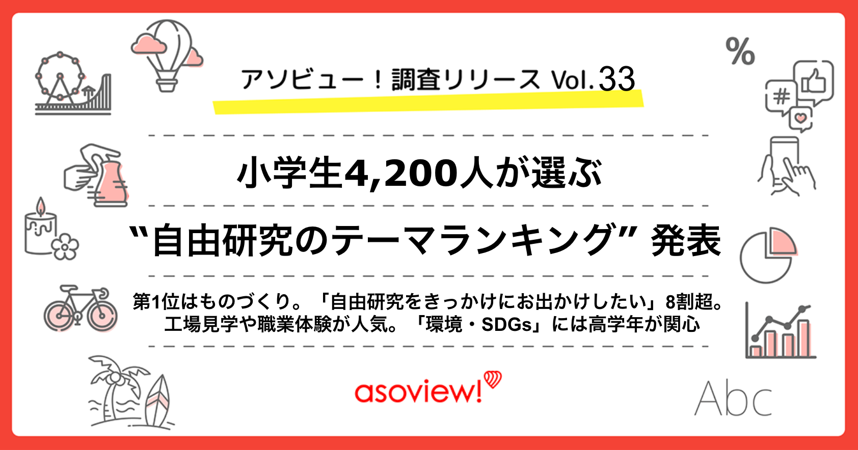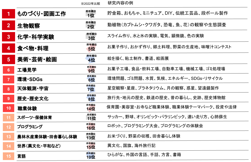 昨年から大きく順位を上げたものとしては、施設に赴いて体験する「工場見学」「職業体験」、大会や体験会に参加するという声の多かった「プログラミング」など、家の外にお出かけして取り組む自由研究テーマが挙げられます。新型コロナウイルスが5類に移行されて以降初めての夏ということもあり、外出へのハードルが下がったことや、子ども向けイベントの開催が増えたことも影響しているのではないかと考えられます。