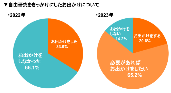 自由研究をきっかけにしたお出かけについて調査したところ、2022年の夏休みは「お出かけをしなかった」が66.1%と半数以上を占めたのに対し、2023年は「お出かけをする」が20.6%、「必要があればお出かけをしたい」が65.2%と、お出かけ意欲のある家庭は8割に上りました。新型コロナウイルスの5類移行後初めての夏休み、昨年は自宅で自由研究に取り組んだ家庭も、今年は自由研究をきっかけにお出かけをしたいと考えていることが伺えます。上述の通り、「工場見学」「職業体験」など外にお出かけして取り組むテーマの人気が上昇していることも、外出意欲の高まりの背景であると考えられます。