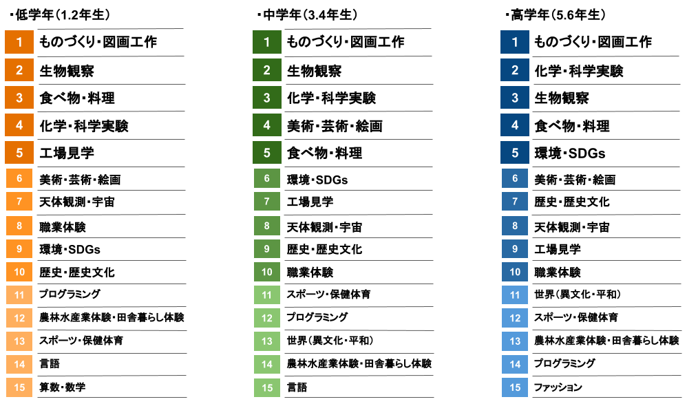 「工場見学」「プログラミング」は低学年でそれぞれ第5位、第11位と、他学年に比べて順位が高くなっており、特に低学年からの支持を集めていることがわかります。一方、「環境・SDGs」「歴史・歴史文化」の分野は、学年が上がるにつれて順位を上げる結果となりました。環境問題・ゴミ問題・水質・気候などのテーマや、歴史に関するテーマには、生活科から理科と社会に分かれる3年生以降、関心を持って取り組む小学生が多くなっています。
