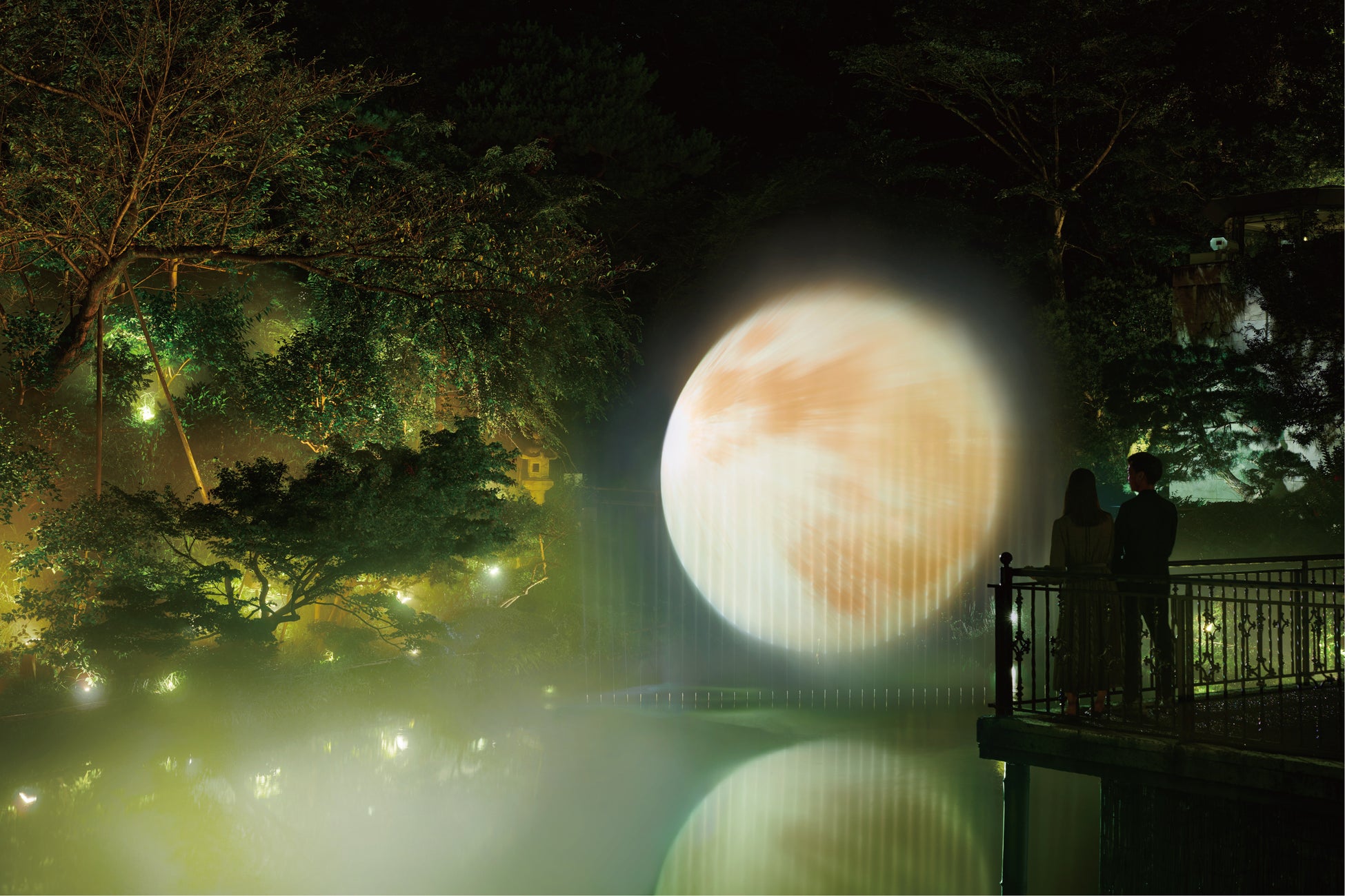 昨今、月の周回旅行等が話題になっておりますが、幽翠池の水上に現れるタテ約6m×ヨコ約8mの「雲海スクリーン」に投影されるのは、直径約3mの「月」。東京で一番近く月を見られるお月見スポットかもしれません。