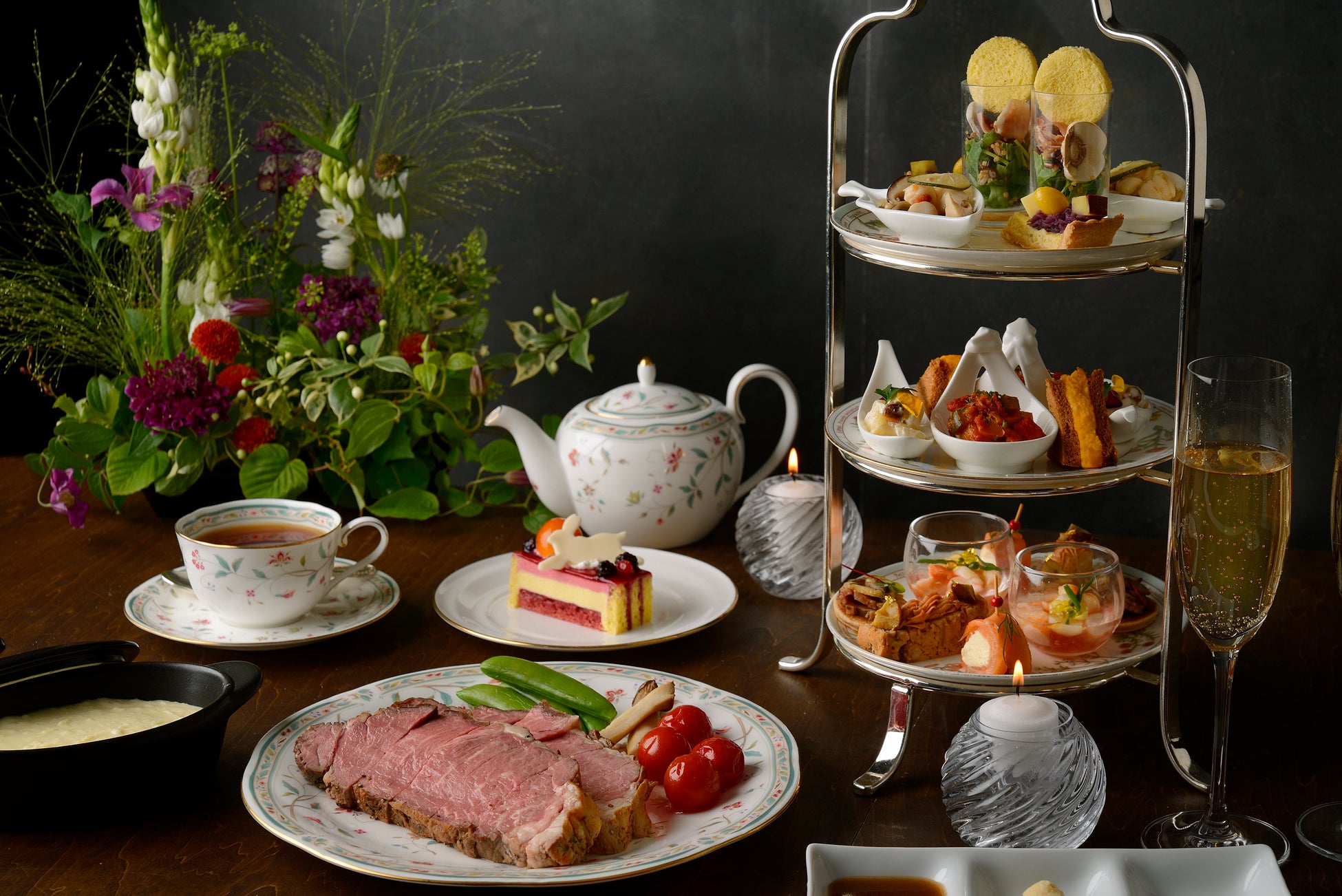 グラスシャンパン、三段のオードブルスタンド、ローストビーフ、デザートのついたイブニングハイティー。三段のオードブルスタンドには、月をイメージしたオードブルをはじめ、秋に旬を迎えるさつまいもやカボチャ、茸などを使用したこの季節ならではの内容が並びます。