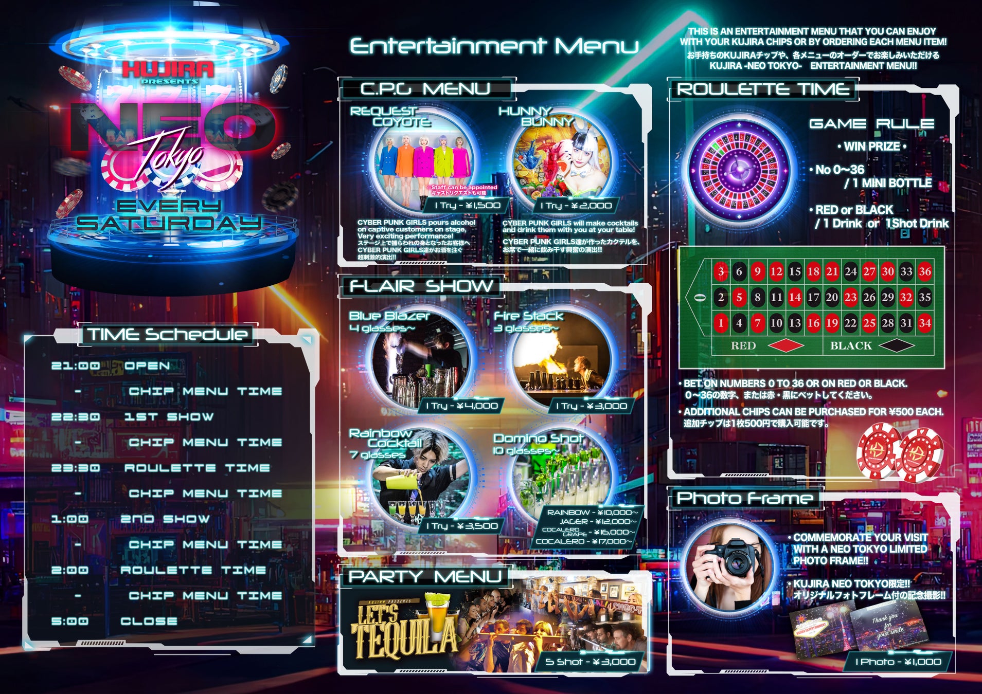 サイバーパンク×TOKYOをイメージした独自コンセプトの店内で、シーシャや100種類以上のカクテル、食事が楽しめるKUJIRA。なかでもパフォーマーキャストが提供するエンタメメニューはインバウンドのお客様に大変な人気を集めています。