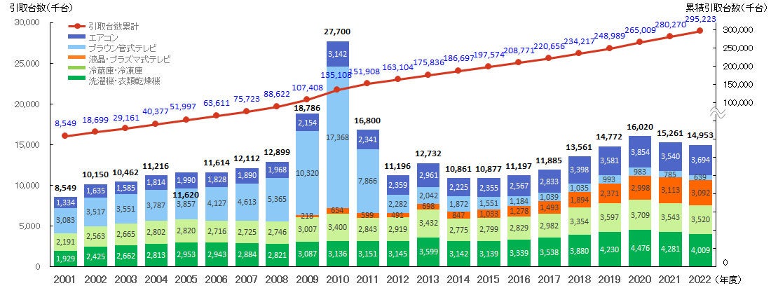 2001年家電リサイクル制度施行からの22年間の廃家電4品目累積引取台数は、295,223千台、