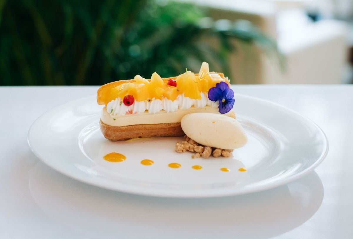 パッションのクレムーとジャスミンティーのセミフレッド、ライムでマリネしたマンゴーとパイナップルを乗せたエクレアに、マンゴーアイスを添えた夏らしい爽やかなデザートです。