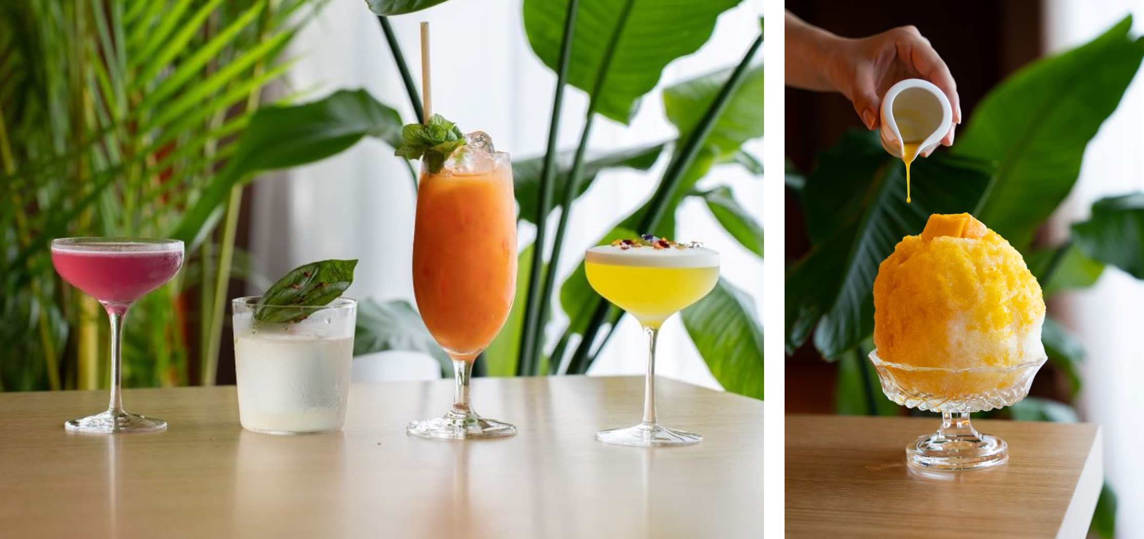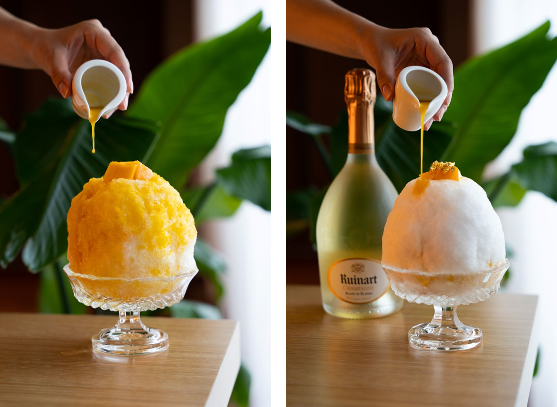 夏に旬を迎える最高級の国産マンゴーを使った2種類のプレミアムなかき氷。味、香りの良いマンゴーを選りすぐり創り上げたシェフ特製のシロップ、そしてトッピングのフレッシュマンゴーでジューシーな味わいを存分にお愉しみいただけます。氷に忍ばせた、レモングラス、レモンバーム、スペアミントのハーブゼリーが爽やかさをプラスします。 シャルドネの芸術と称されるメゾンのフラッグシップであるルイナール ブラン ド ブランをふわふわの氷に仕上げ、マンゴーとともにご堪能いただくエレガントなシャンパーニュかき氷もご用意しました。