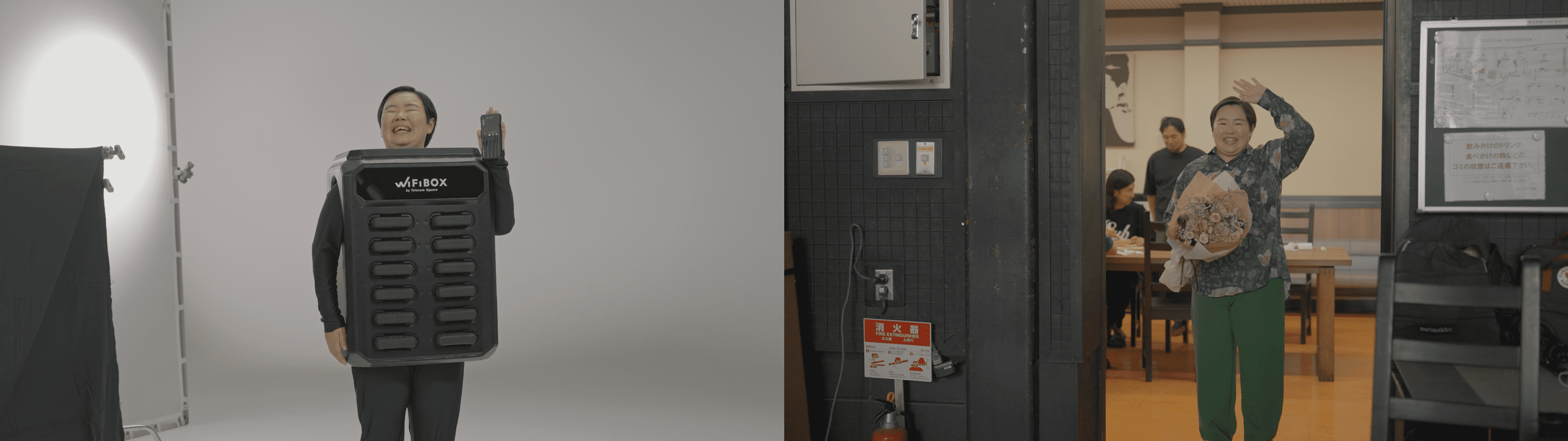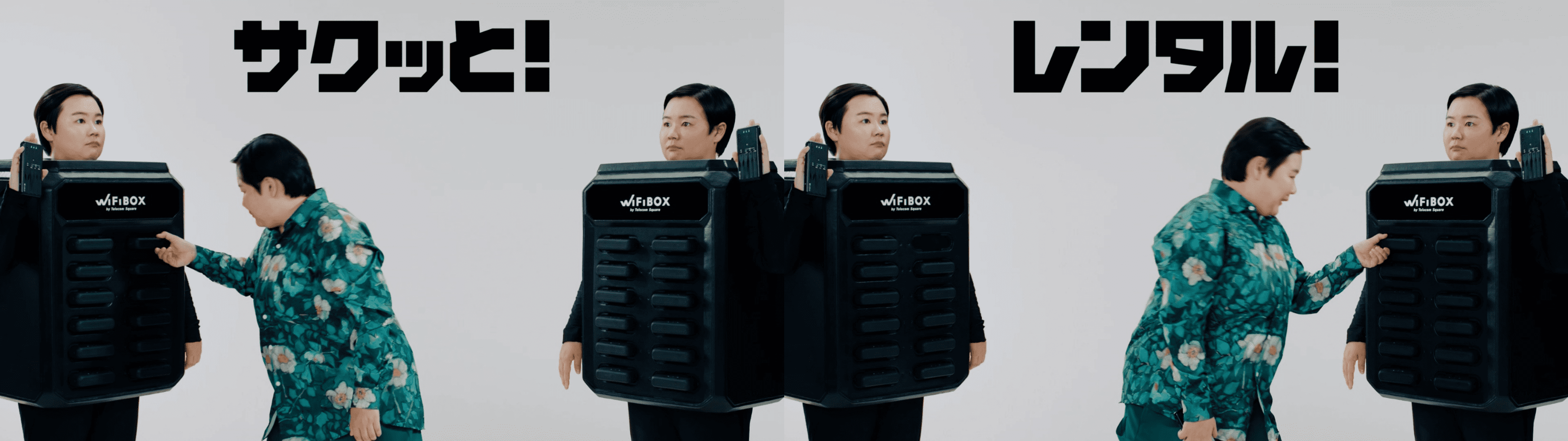 また、やす子さんの持ちギャグ「はい~」と、「海~」「外~」「Wi~」「Fi~」が非常にフィットして、WiFiBOXのサービスをシンプルに表現してくれる楽しいWebCMが完成しました。