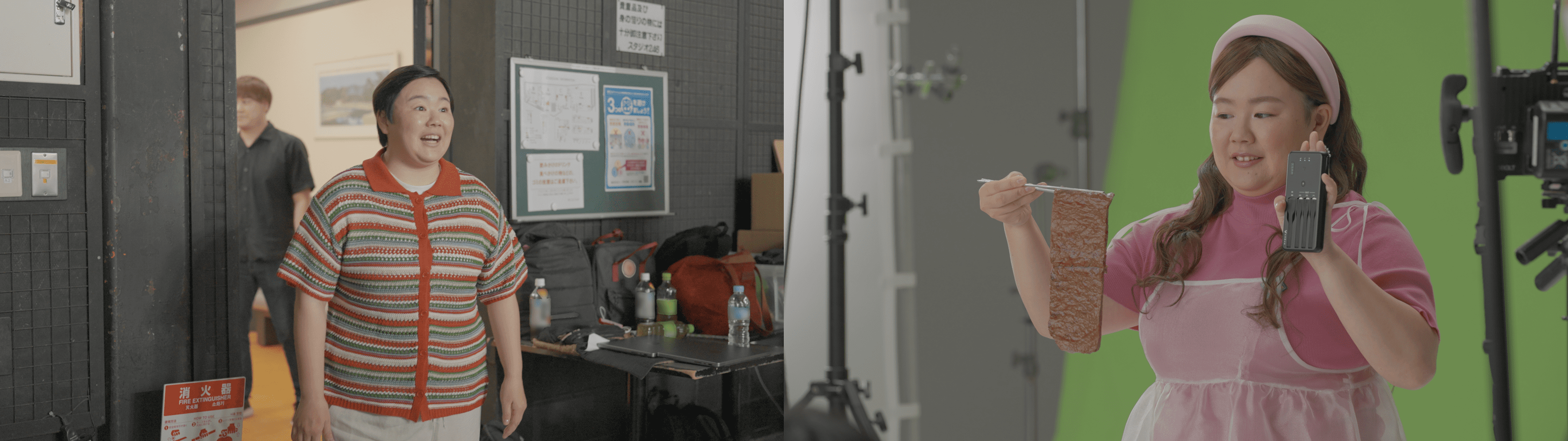 撮影中には、周りのスタッフにも「水分補給してくださいね!」「しっかりと晩御飯食べてくださいね!」とやす子さん自ら直接声がけをされ、普段のお人柄の良さを垣間見ることができました。スタッフとの打ち合わせ中などコミュニケーションを取る際には、「はい~」が自然とたくさん出ていたところも、やす子さんらしさを感じた撮影現場でした。