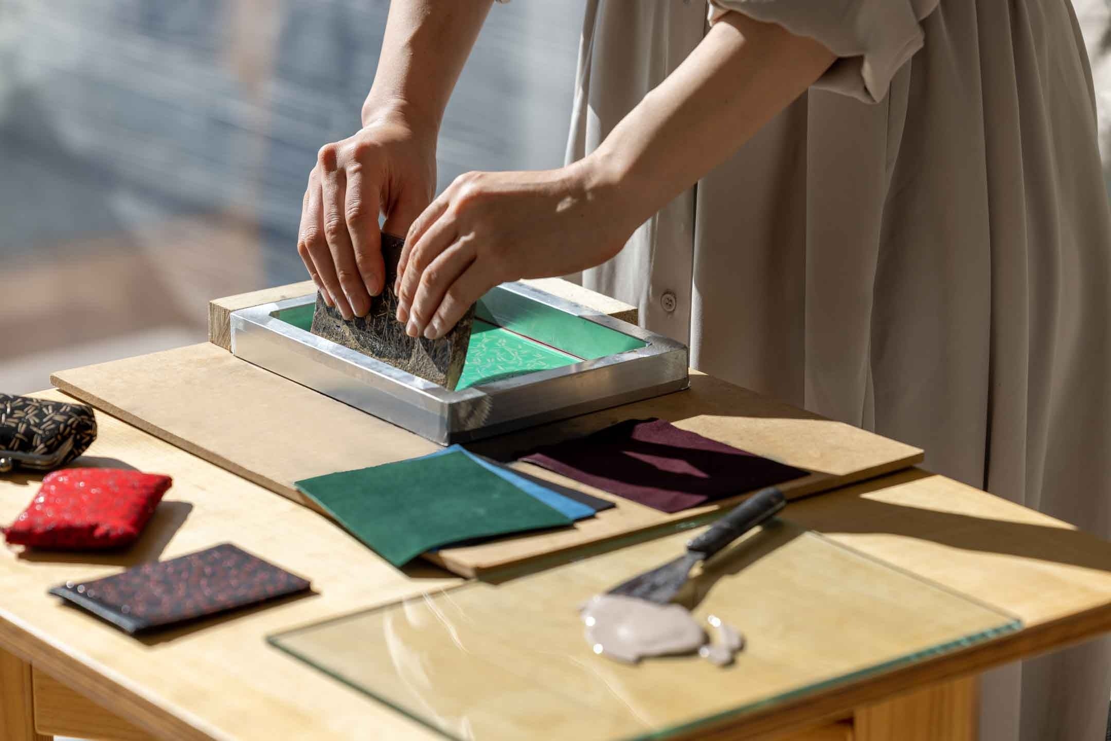 「甲州印伝」は、染め上げられた鹿革に様々な柄の型を用いて漆付けが行われる鹿革工芸品です。軽くて柔らかい質感でありながら丈夫である鹿革は、古くは武具に使われていました。鹿革に美しい文様があしらわれた甲州印伝は数百年の歴史を持ち、地域の人々から特別な持ち物として愛用されています。当ツアーでは、その甲州印伝を作るうえで要となる、漆付けを印伝職人と一緒に星のや富士のキャビンで行います。漆付けを教えてくれるのは、甲州印伝の伝統工芸士(総合部門)の称号を持つ山本裕輔氏です。星のや富士オリジナルの型から好みのものを選び、山本氏の指導のもと、漆付け体験を行います。漆を塗った鹿革は希望の小物に加工され、後日自宅に届けられます。鹿革が伝統工芸品に加工されていく過程を体験することで、命を無駄にすることなく資源として活用する方法を学びます。