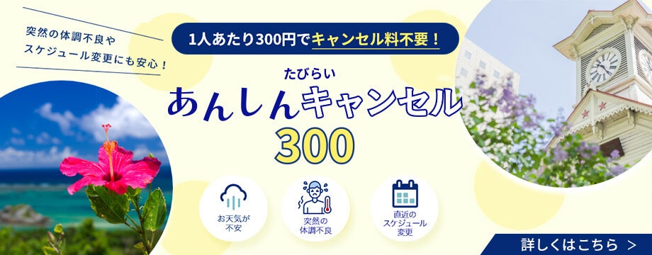 ご利用の際は、たびらいあんしんキャンセル300のサービスページの「ご利用方法」や「よくある質問」をご確認の上、ご利用ください。