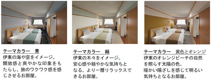 今回、リニューアルした和洋室8室は、伊東にゆかりがあるカラーを コンセプトにしたお部屋です。どの部屋も幅広い世代に親しみやすい優しい 色合いでご用意しており、それぞれのカラーに合わせた壁紙やファブリックなどで統一しております。どのお部屋になるかは宿泊当日、扉を開けるまでのお楽しみです。