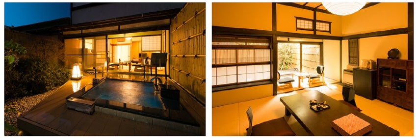 伊東緑涌は、プライベートな空間を大切にした「庭園露天風呂付き客室」です。お庭に面したお部屋で、屋根のない露天風呂は開放感があり、お庭の緑を眺めながら、また夜は月や星を眺めながらお好きな時に温泉を楽しむことができます。伊東小涌園の同敷地内にありますので、大浴場もご利用が可能です。